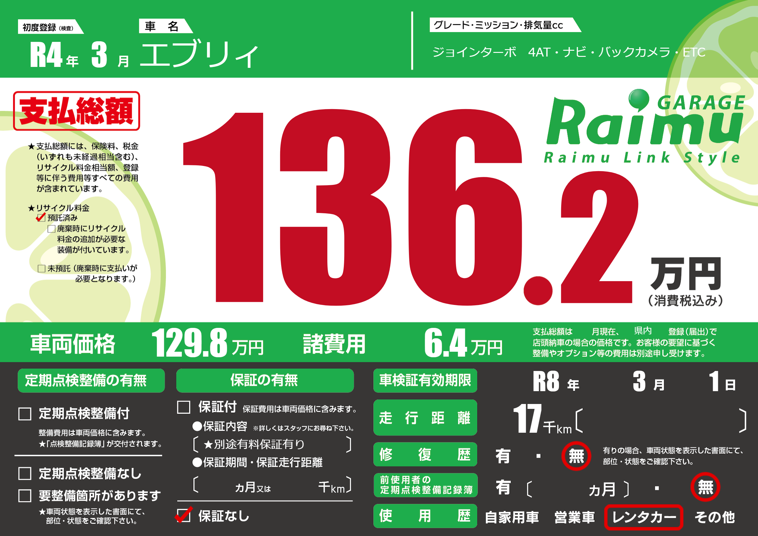なし | 車検制限 | R8年3月1月 |