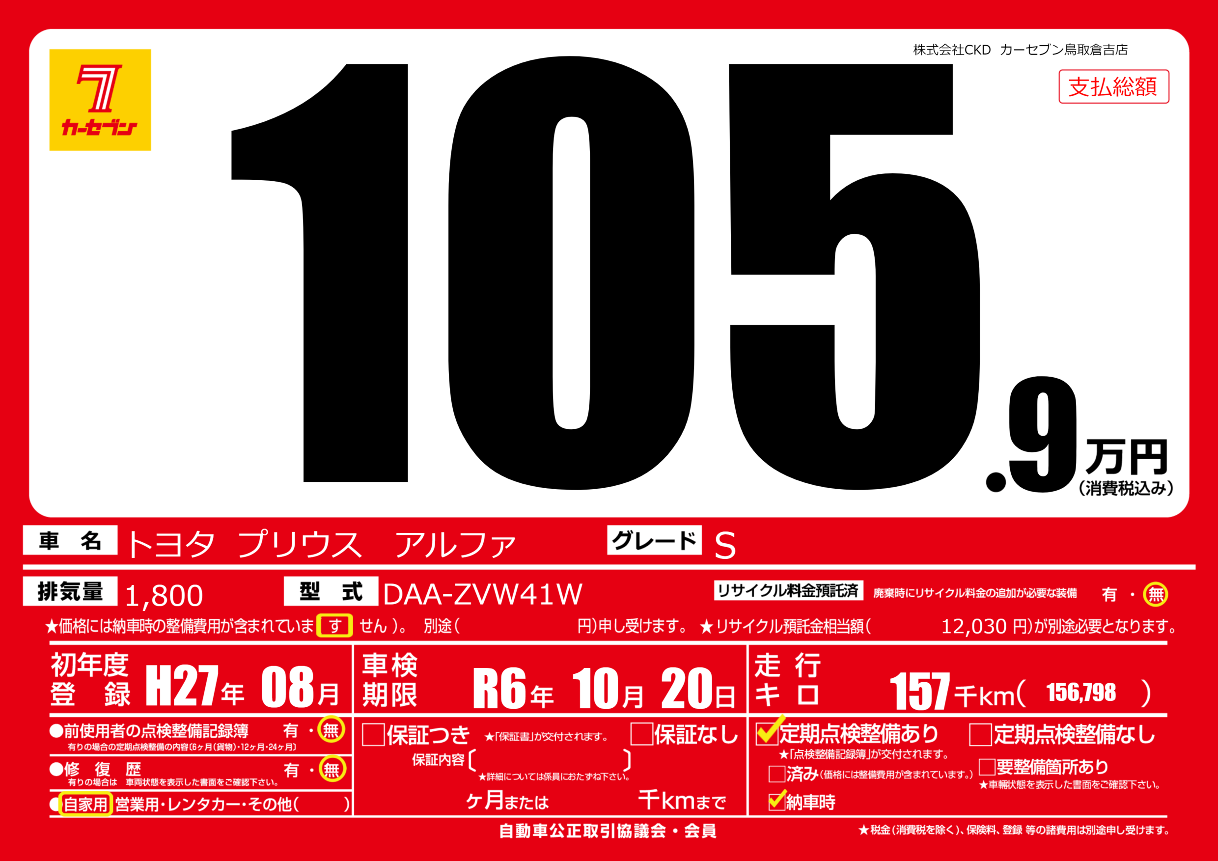 | 走行キロ | 15.7万km | 初年度登録 | H27年08月 |