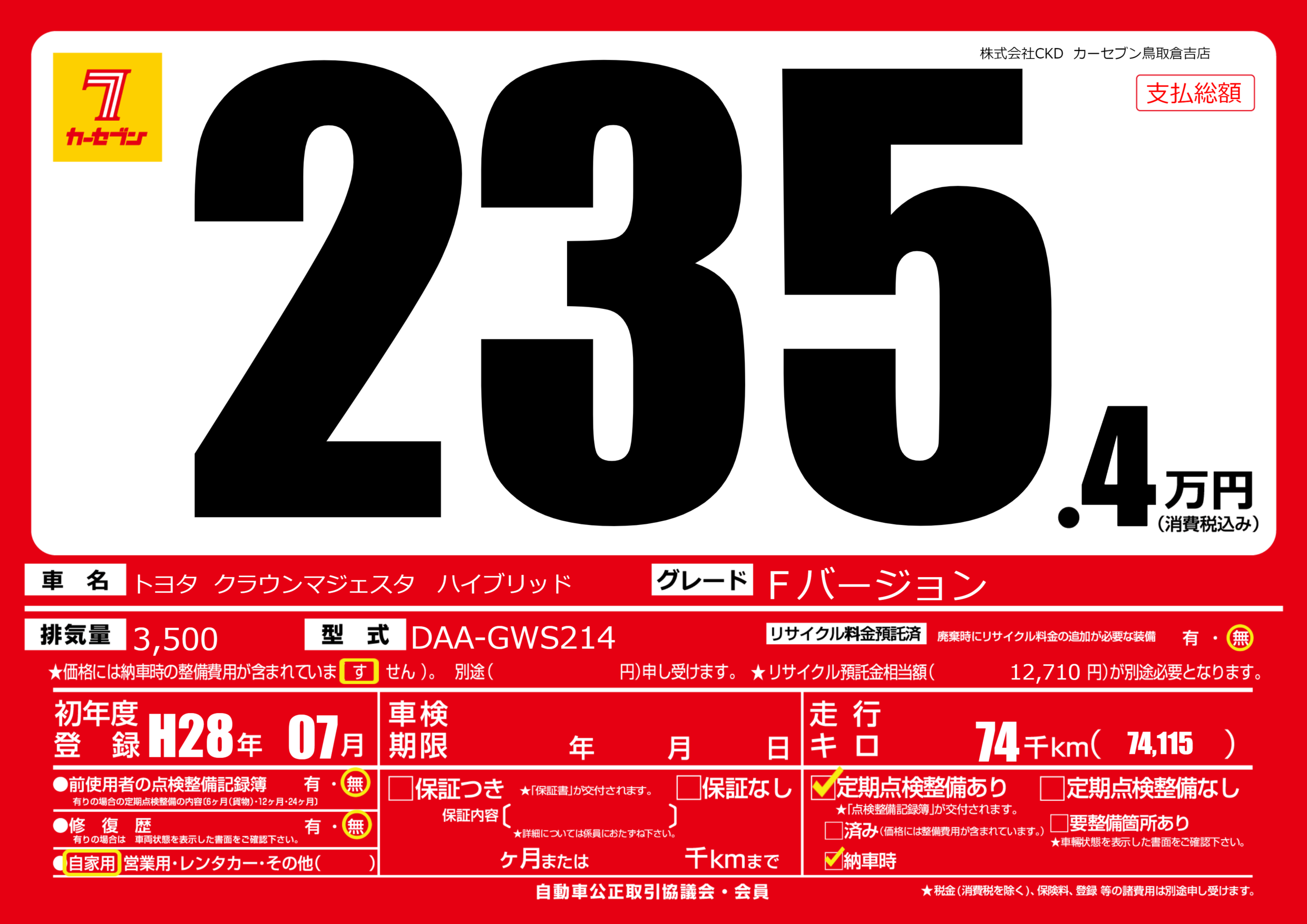 | 車名 | トヨタ クラウンマジェスタ ハイブリッド | グレード ミッション 排気量 |