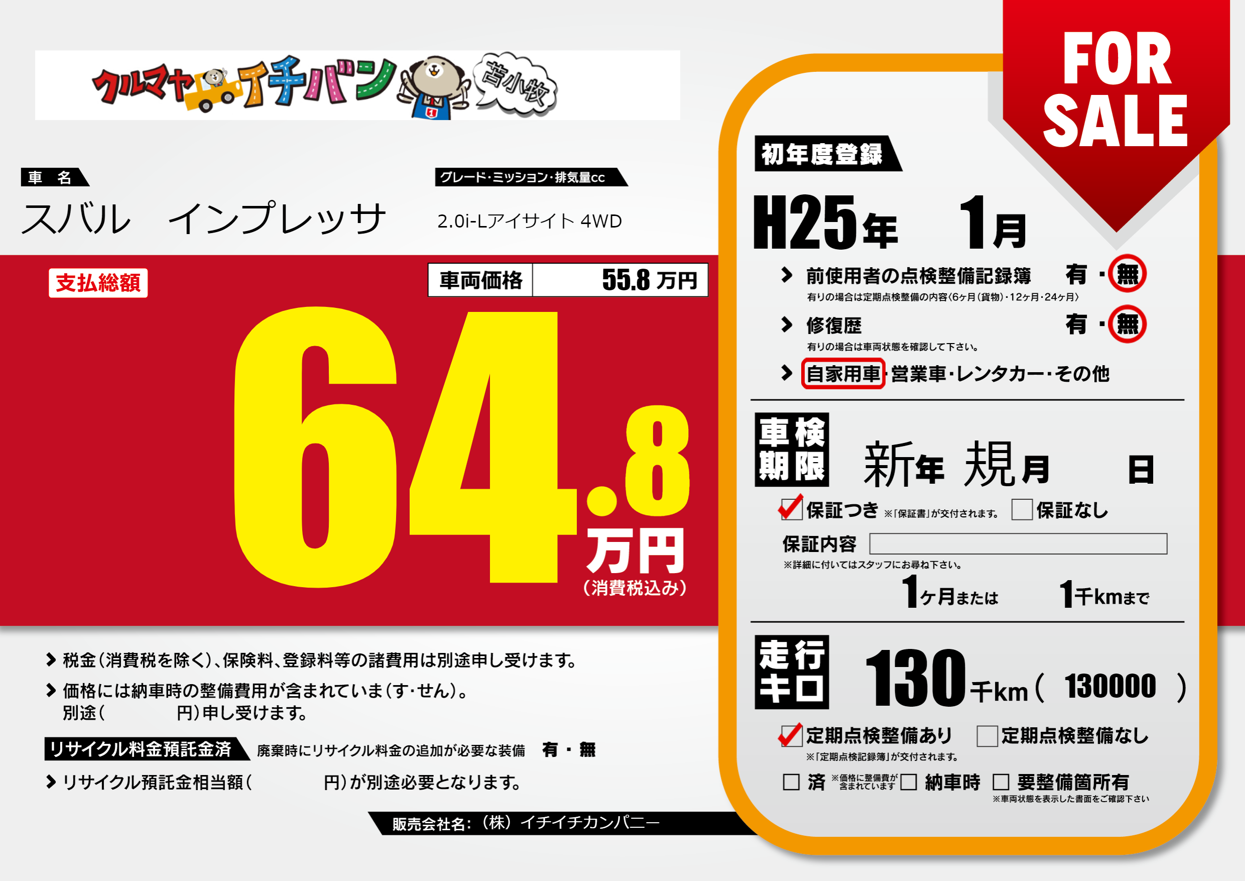 | 車名 | スバル インプレッサ | グレード ミッション 排気量 |