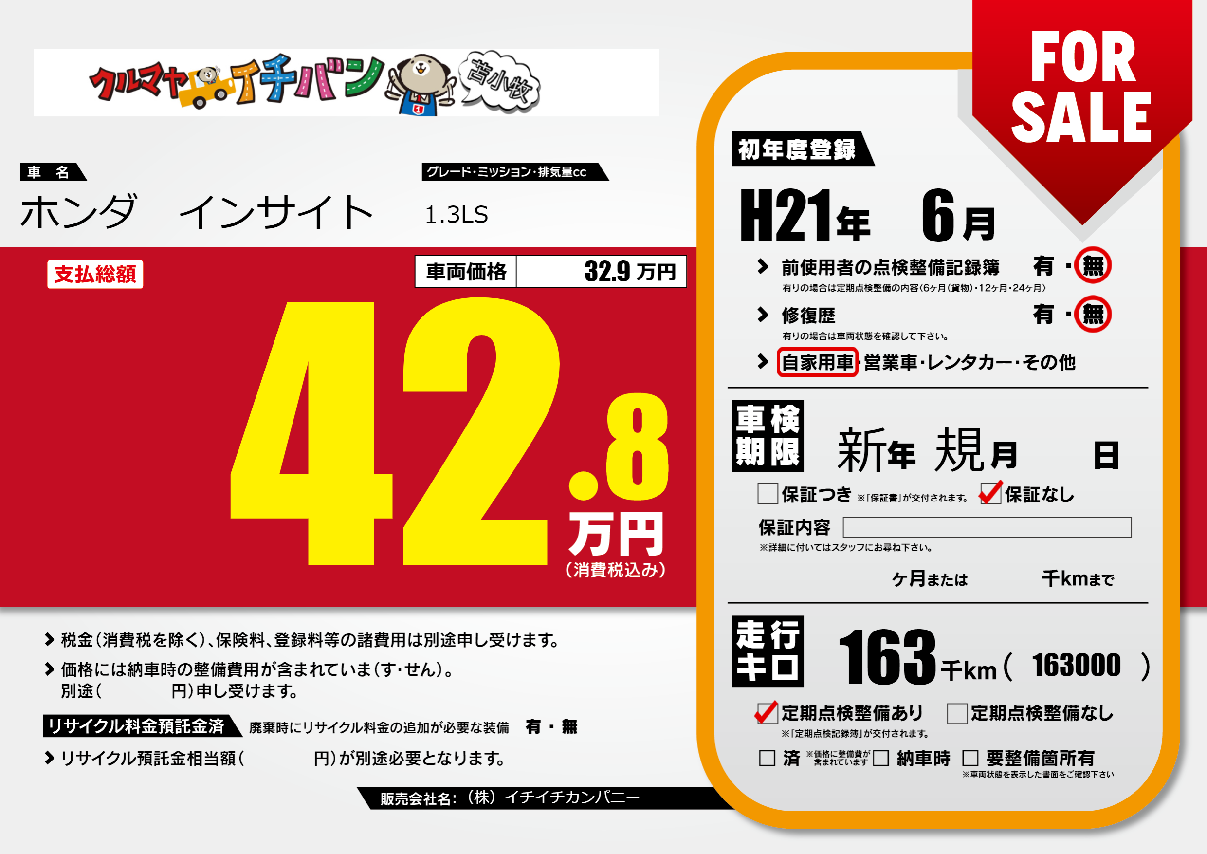 | 走行キロ | 16.3万km | 初年度登録 | H21年6月 |
