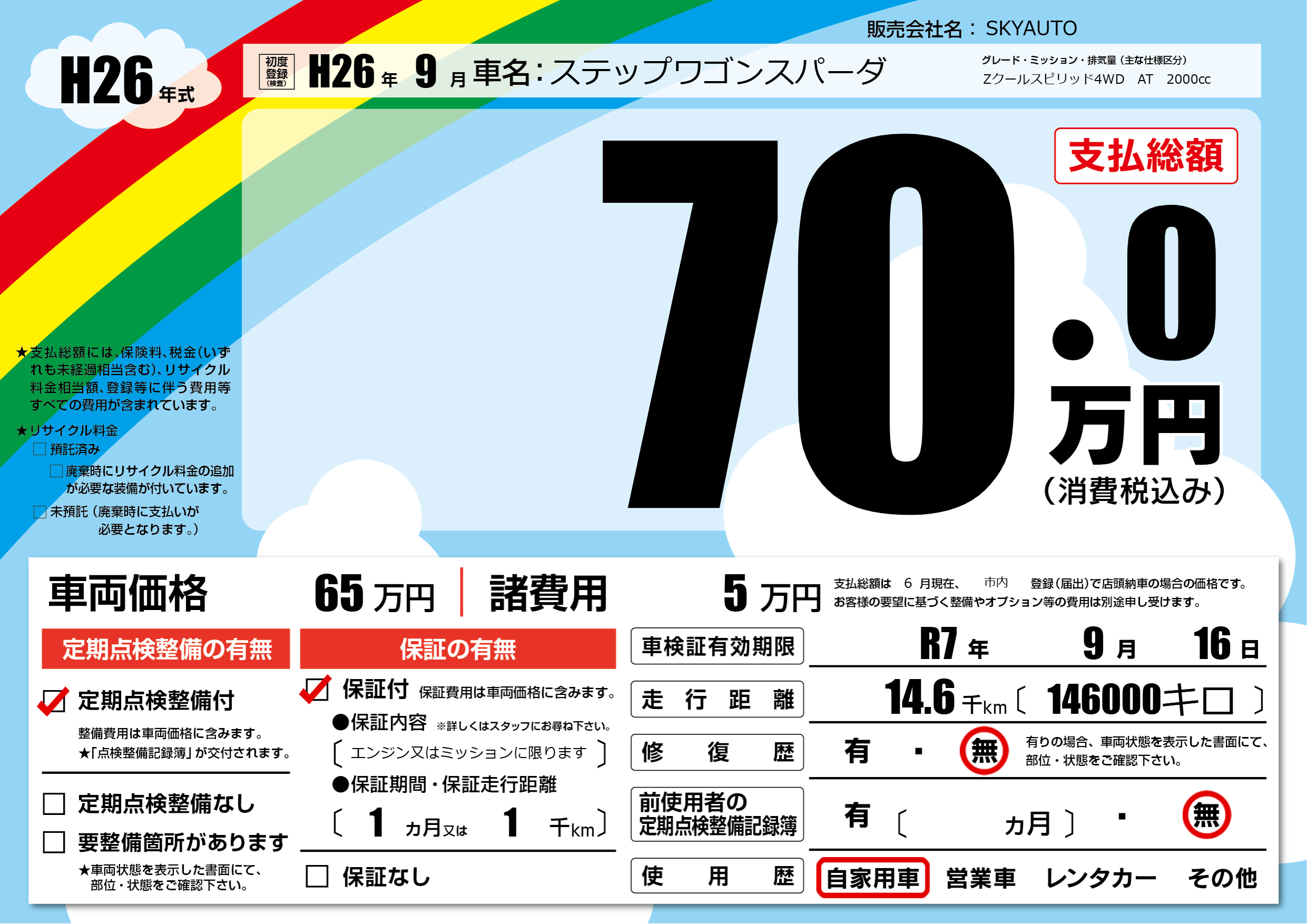 | 走行キロ | 1.4万km | 初年度登録 | H26年9月 |