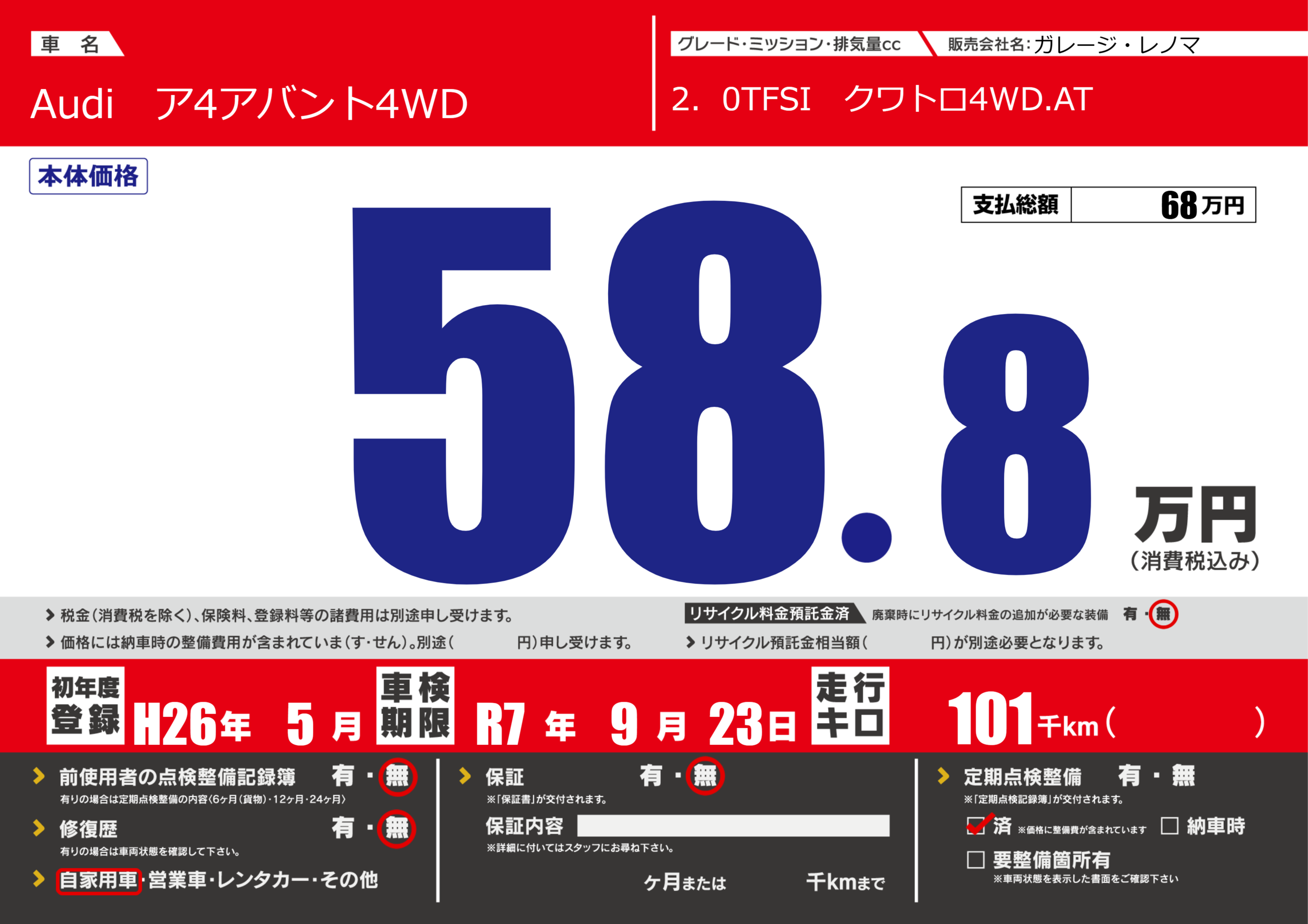 | 車名 | Audi ア4アバント4WD | グレード ミッション 排気量 |