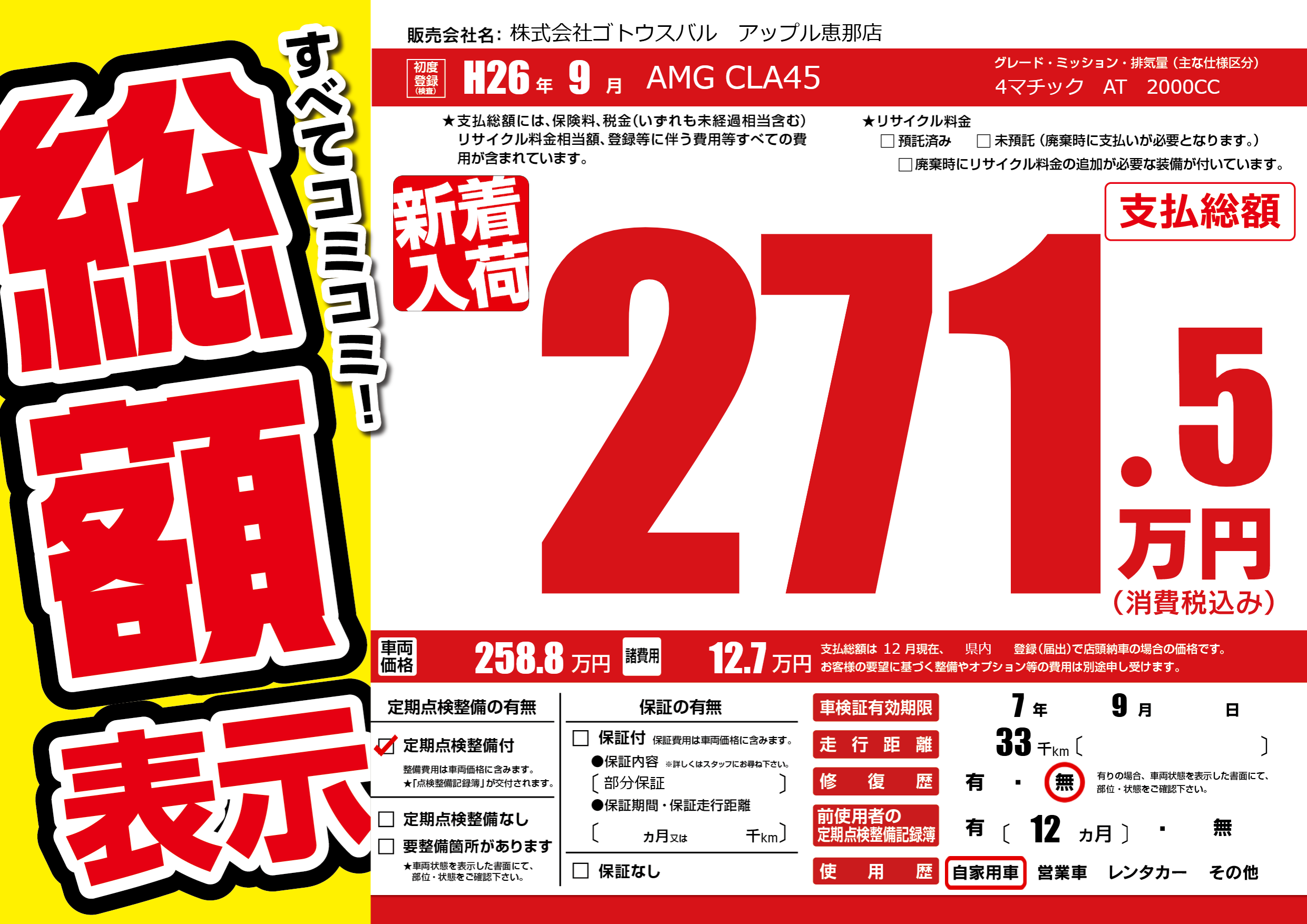 | 車名 | AMG CLA45 | グレード ミッション 排気量 |