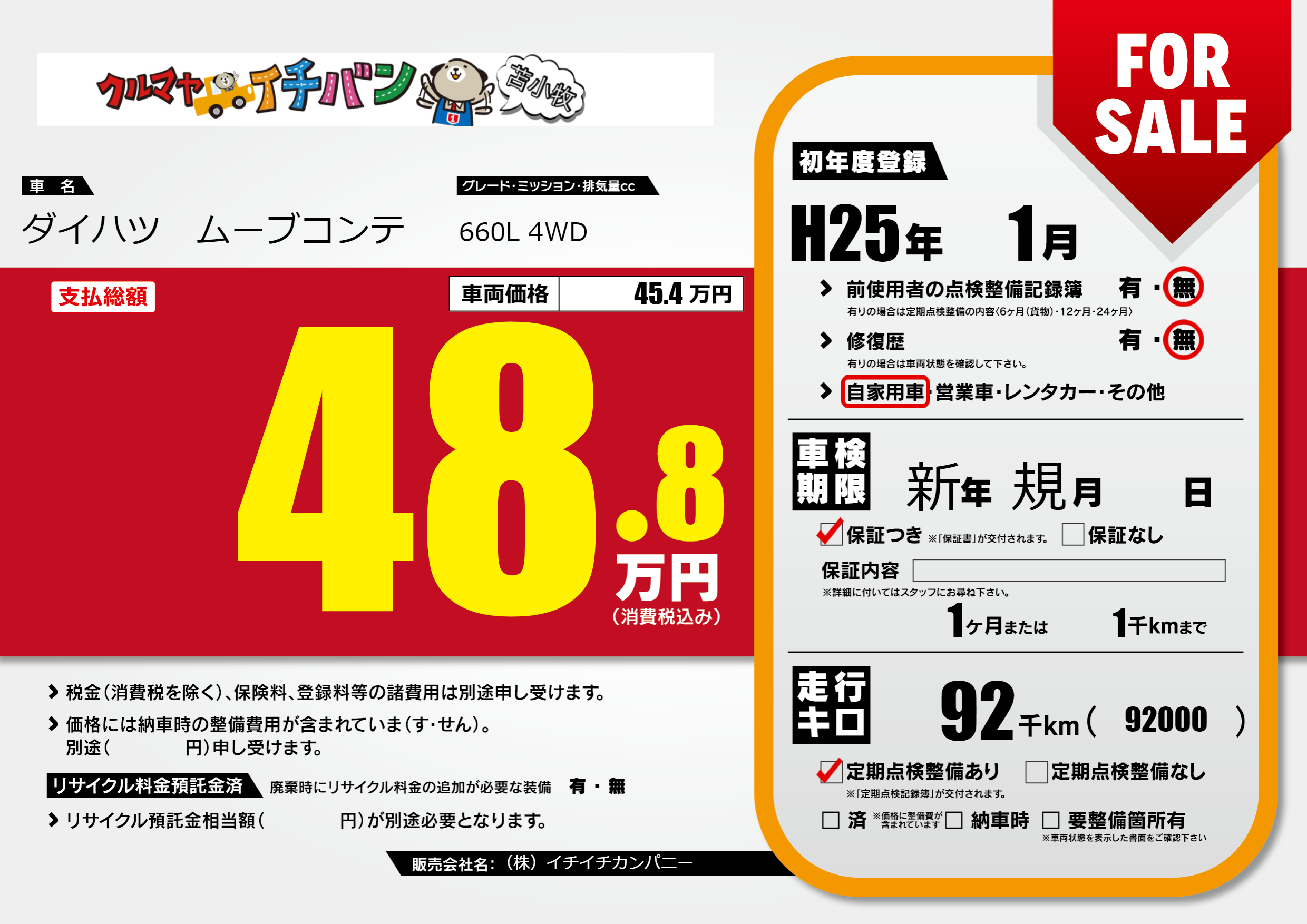 保証付き 保証内容(---) 1ヶ月または(1)千kmまで |
