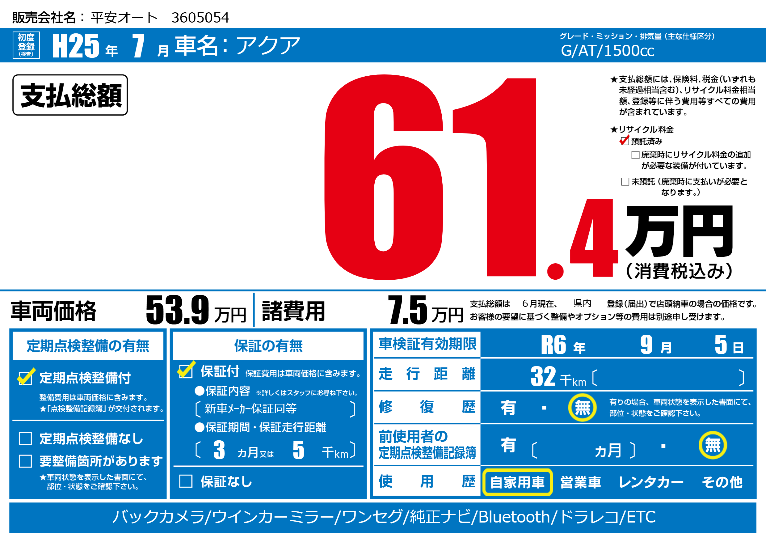 | 車検制限 | R6年 9月 5日 | ||