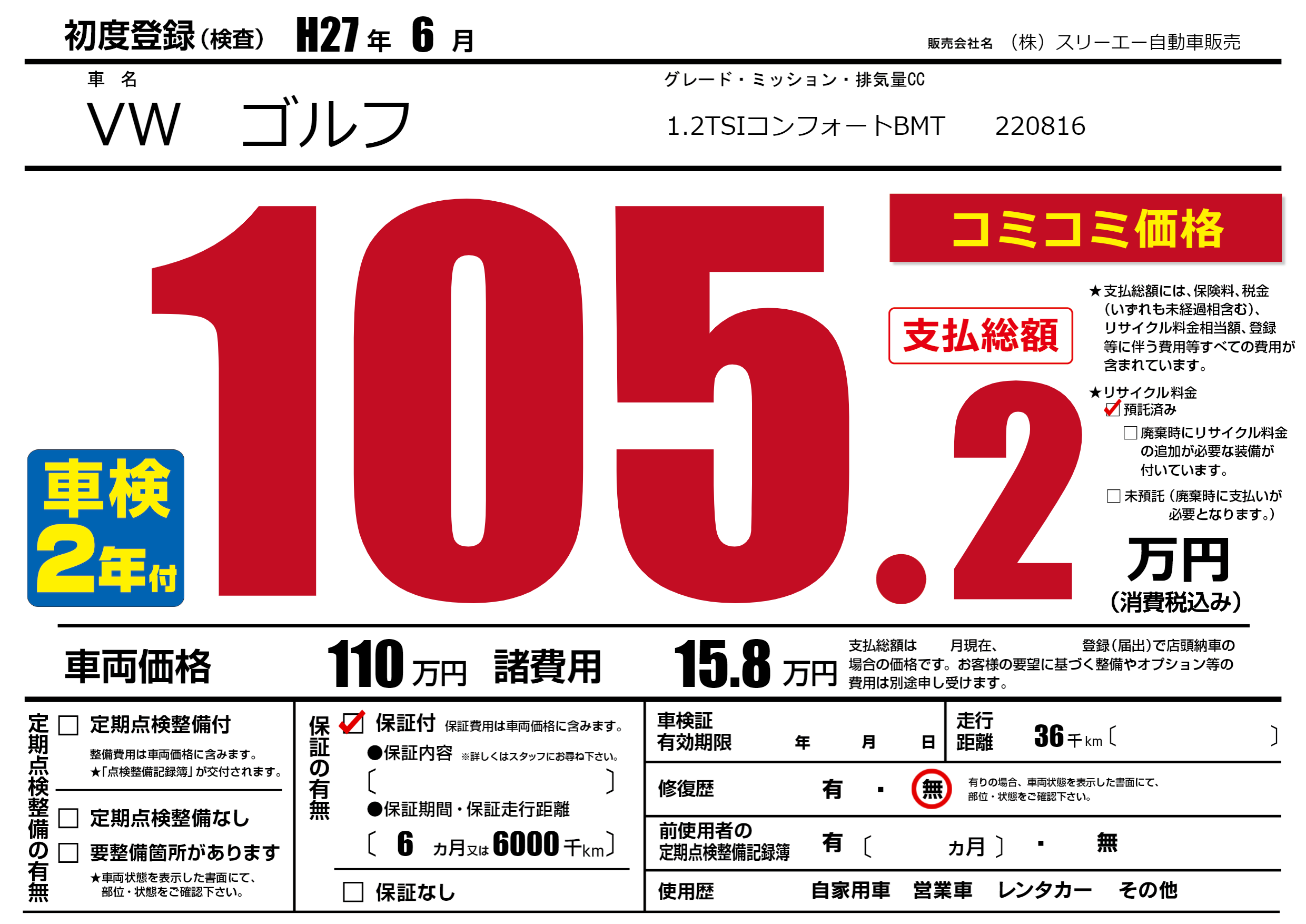 | 車名 | VW ゴルフ | グレード ミッション 排気量 |
