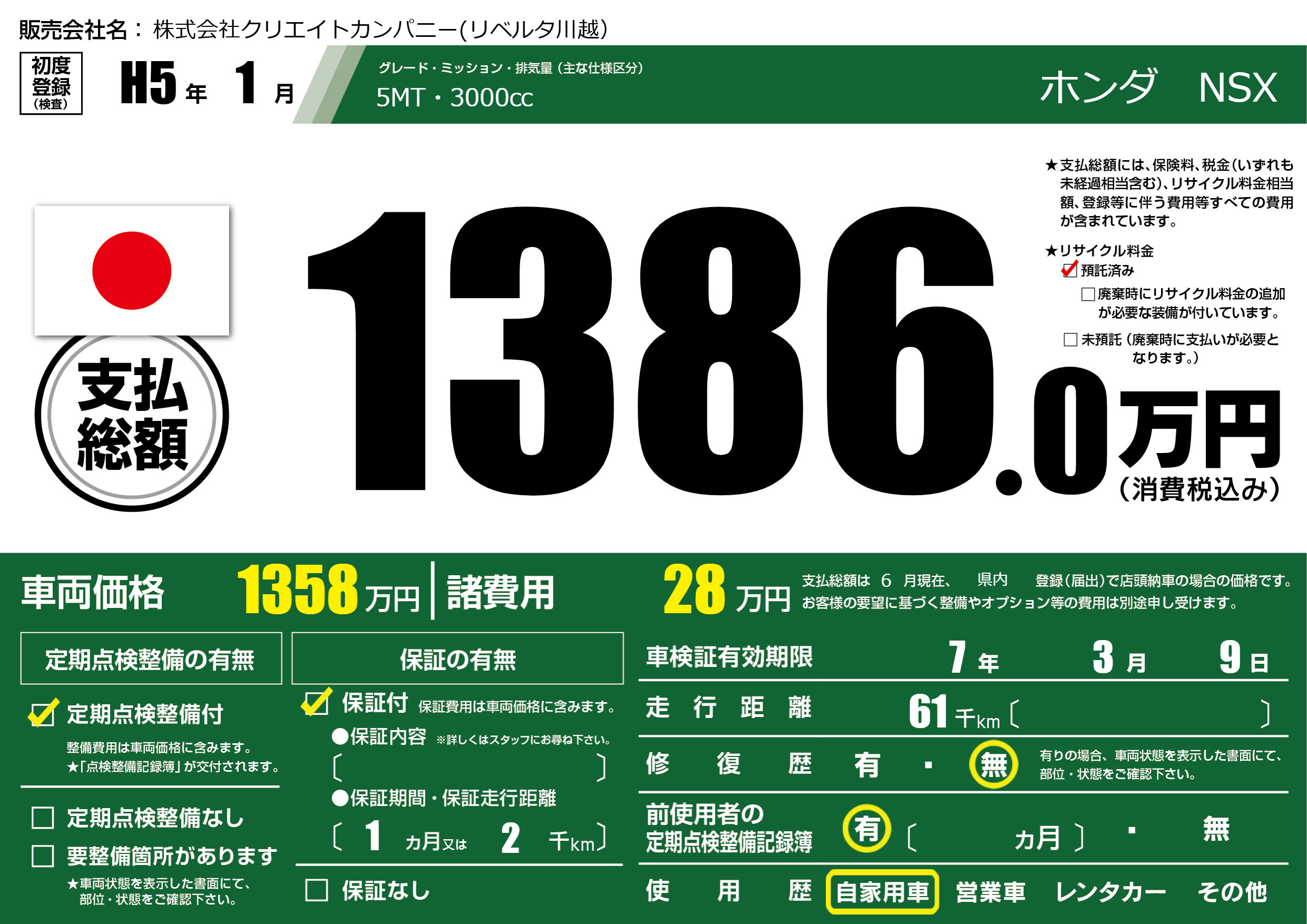 | 車名 | ホンダ NSX | グレード ミッション 排気量 |