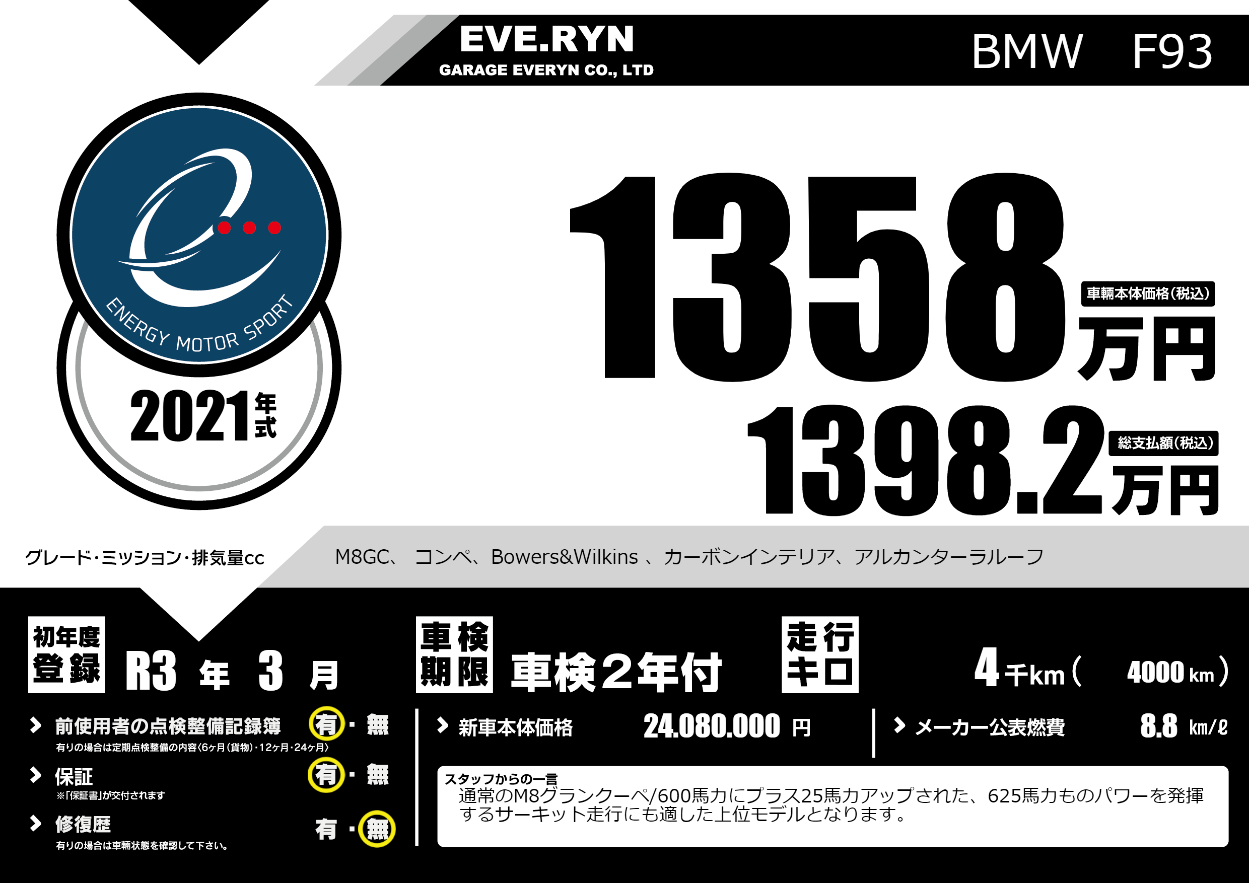 | 車名 | BMW F93 | グレード ミッション 排気量 |
