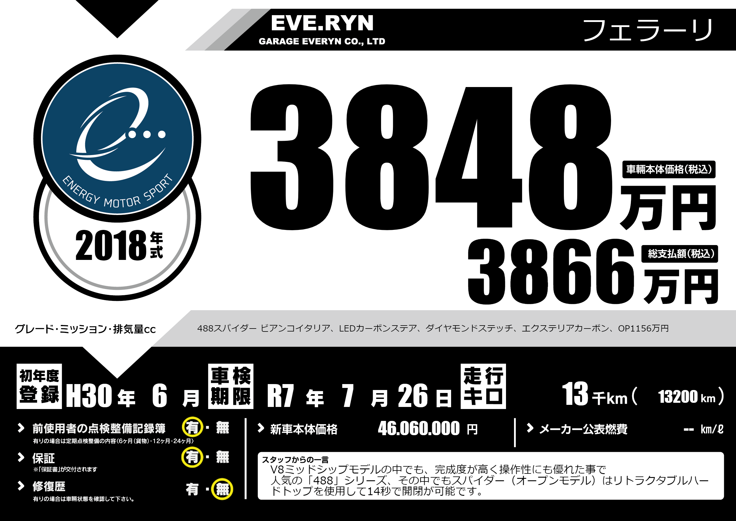488スパイダー ビアンコイタリア、LEDカーボンステア、ダイヤモンドステッチ、エクステリアカーボン、OP1156万円 |