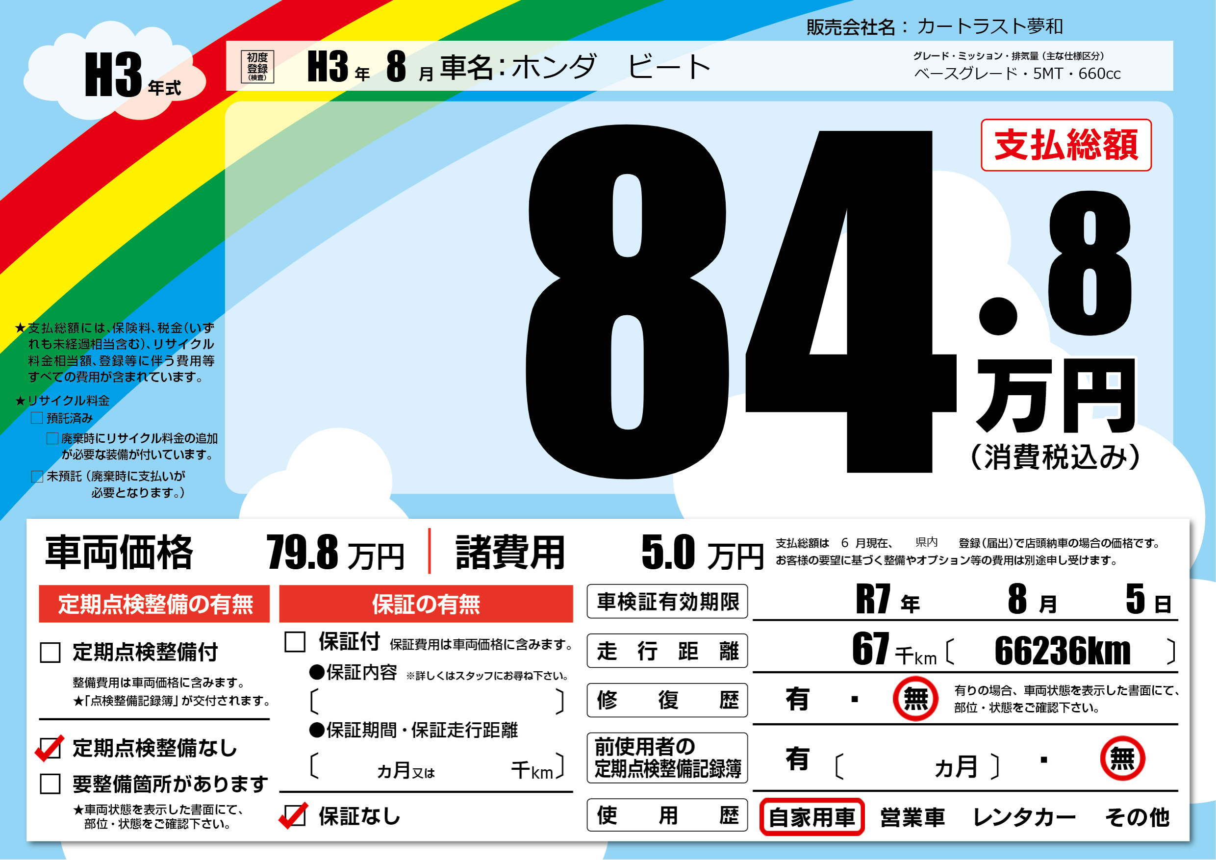 | 車名 | ホンダ ビート | グレード ミッション 排気量 |