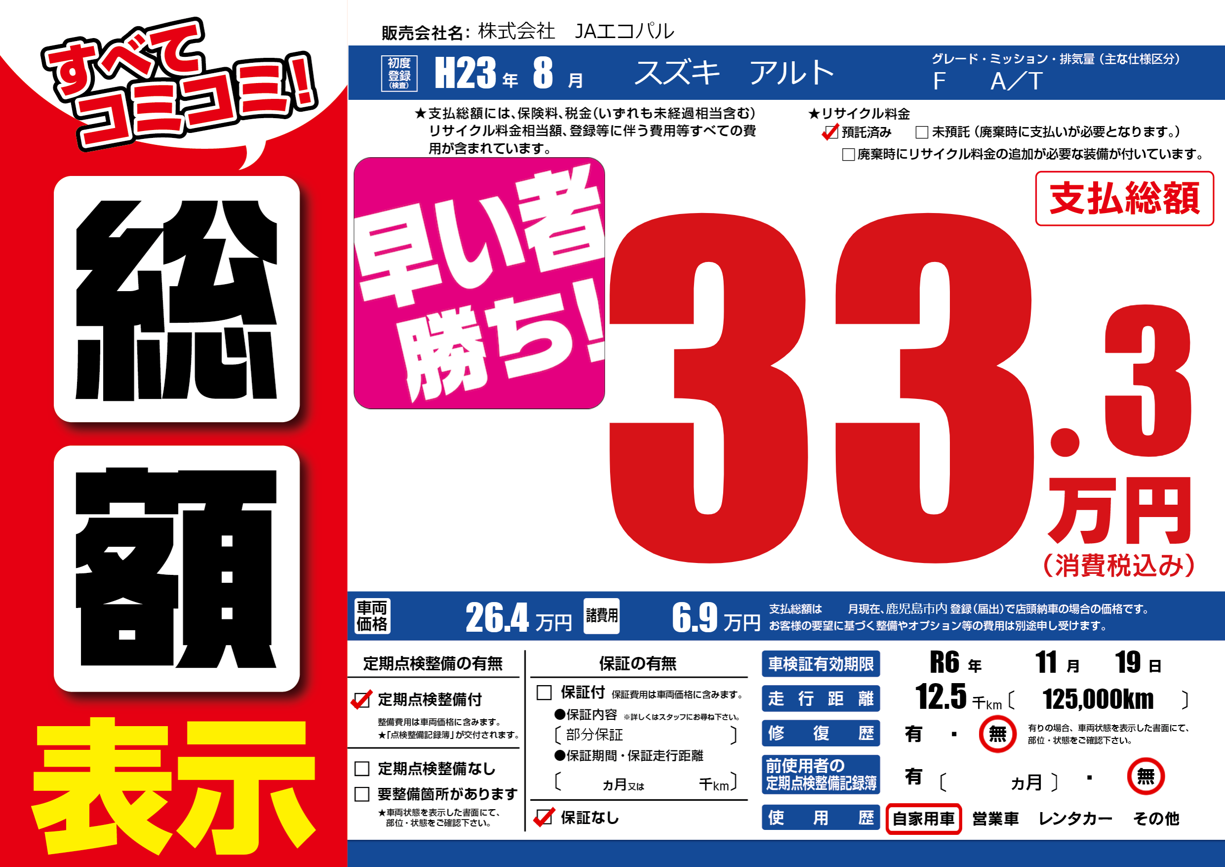 | 車名 | スズキ アルト | グレード ミッション 排気量 |