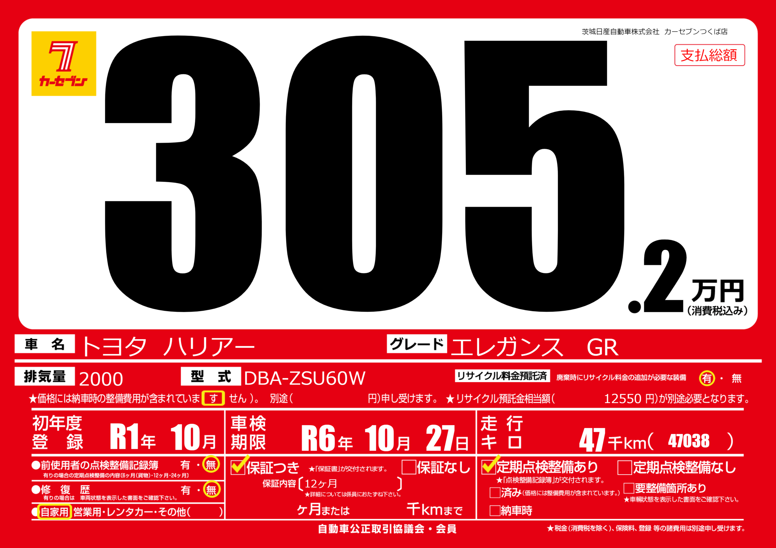 | 車名 | トヨタ ハリアー | グレード ミッション 排気量 |