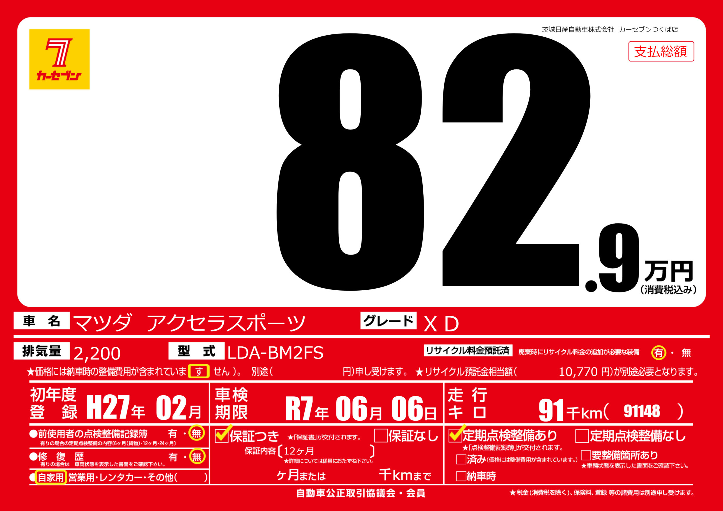 | 車名 | マツダ アクセラスポーツ | グレード ミッション 排気量 |