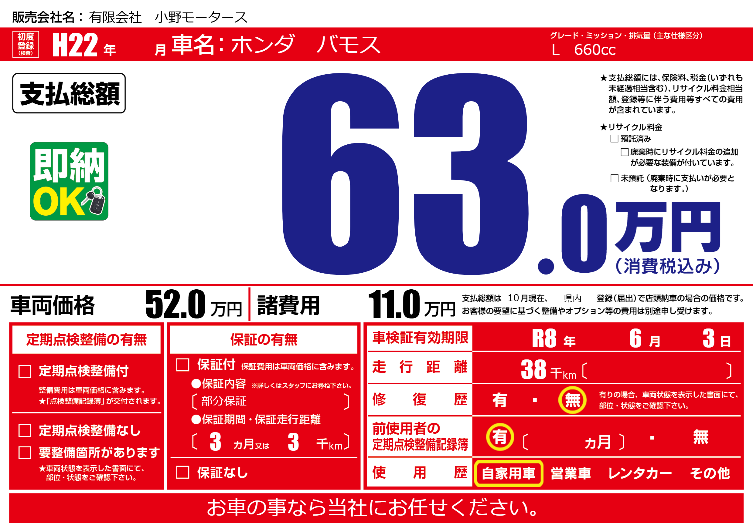 | 車名 | ホンダ バモス | グレード ミッション 排気量 |