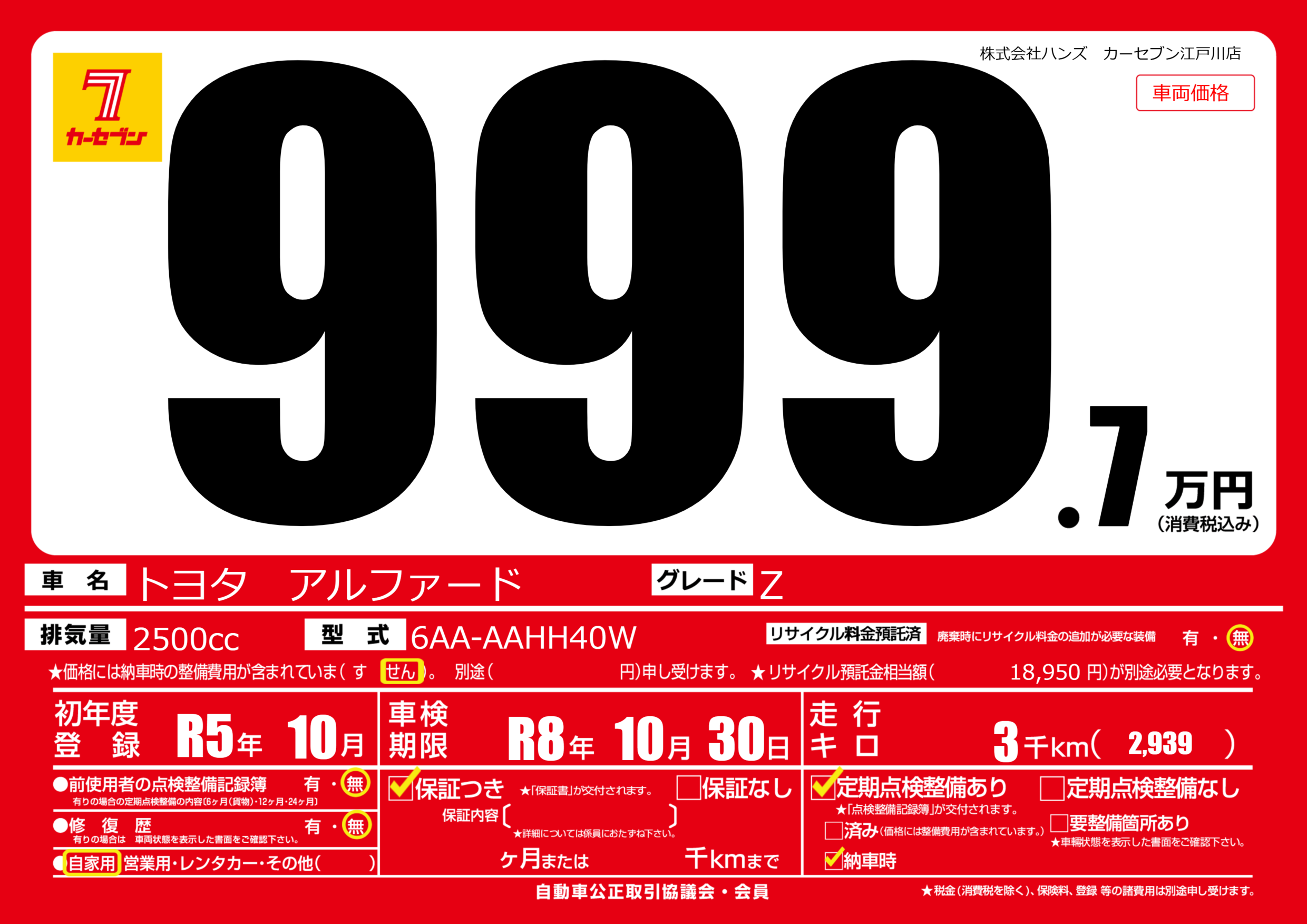 | 走行キロ | 0.3万km | 初年度登録 | R5年10月 |