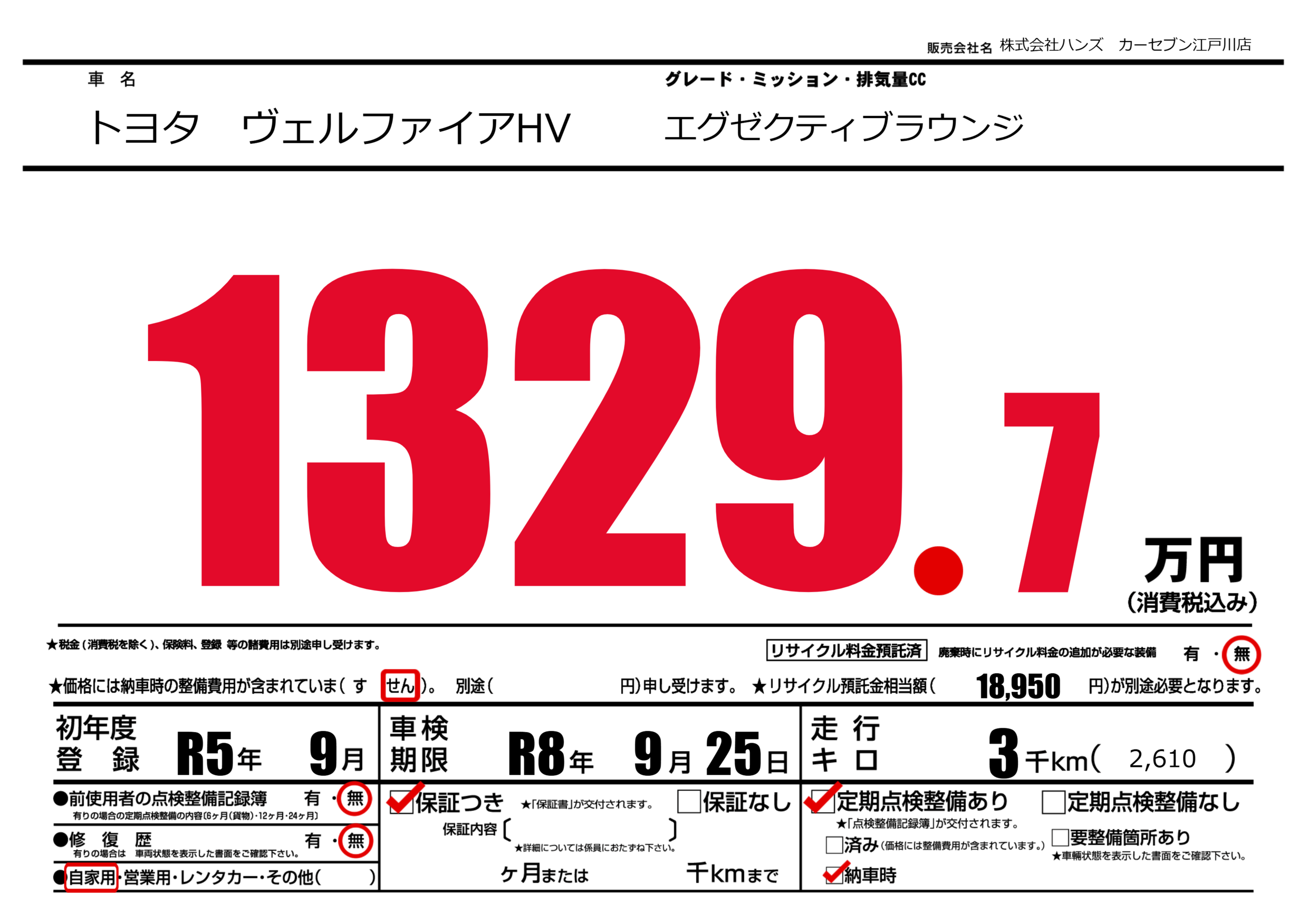 | 走行キロ | 0.3万km | 初年度登録 | R5年9月 |