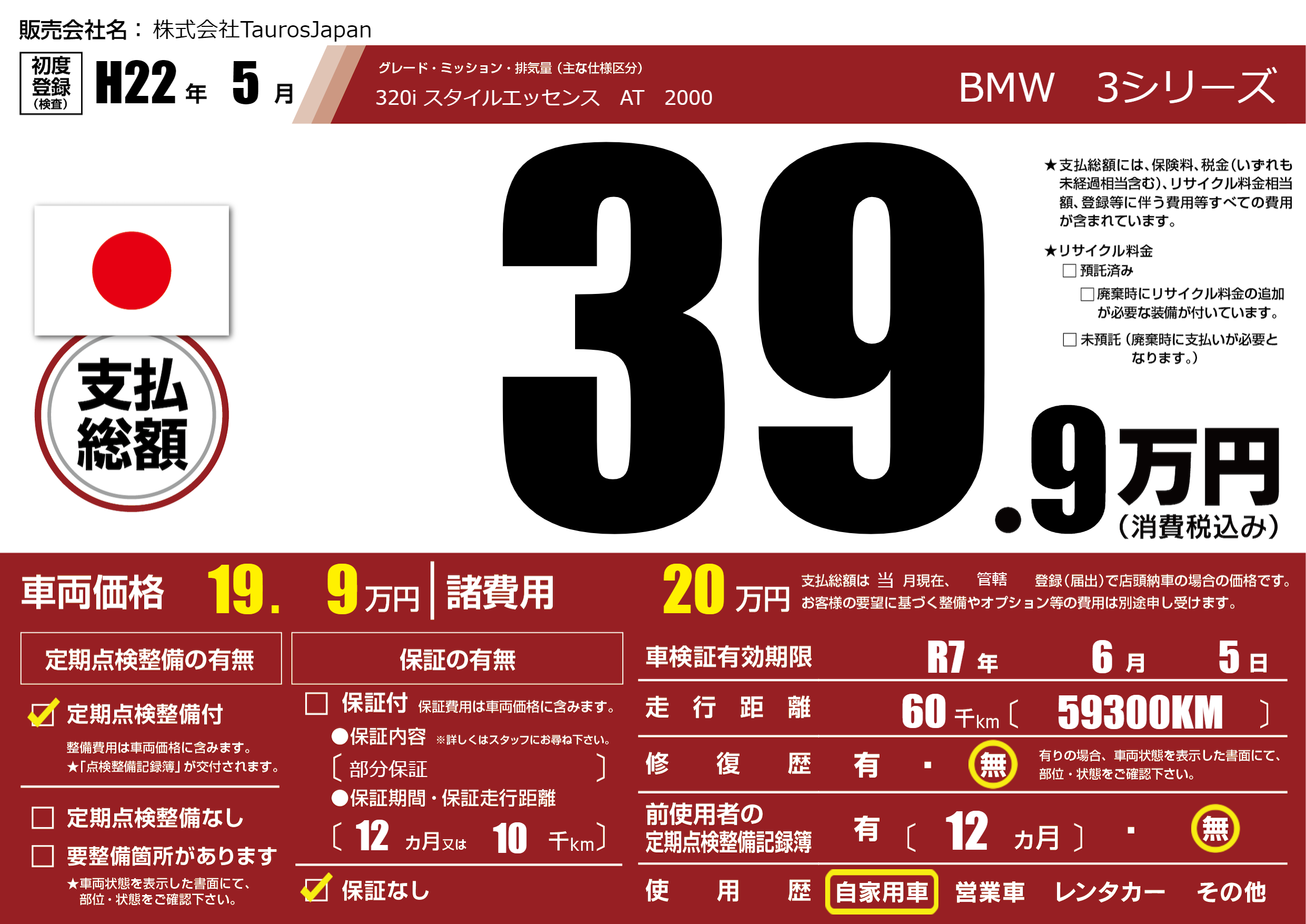 | 車名 | BMW 3シリーズ | グレード ミッション 排気量 |
