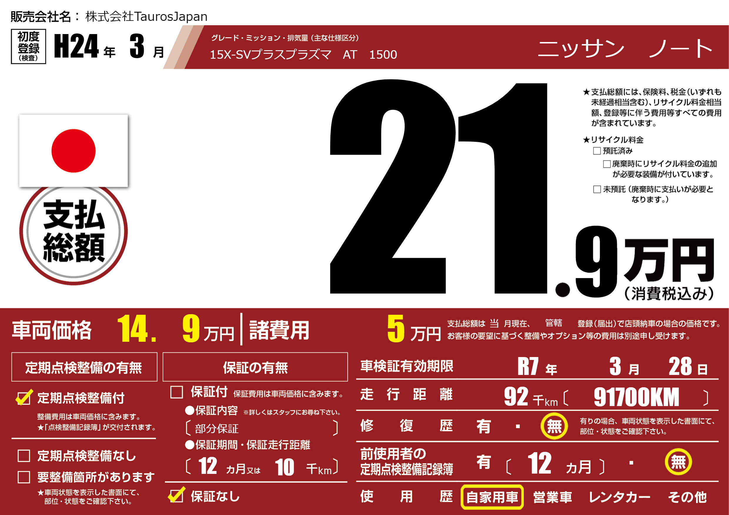 | 走行キロ | 9.2万km | 初年度登録 | H24年3月 |