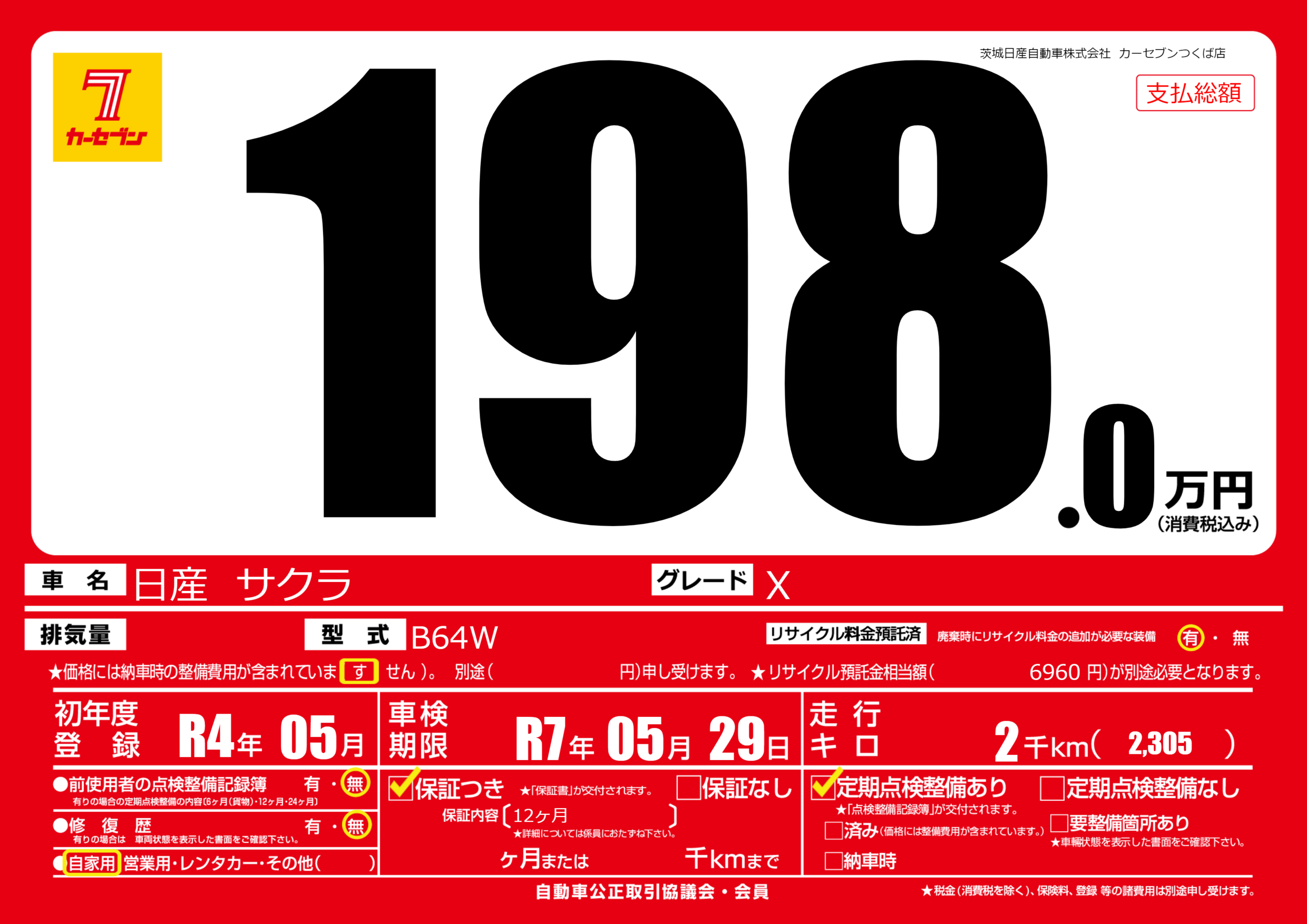 | 車名 | 日産 サクラ | グレード ミッション 排気量 |