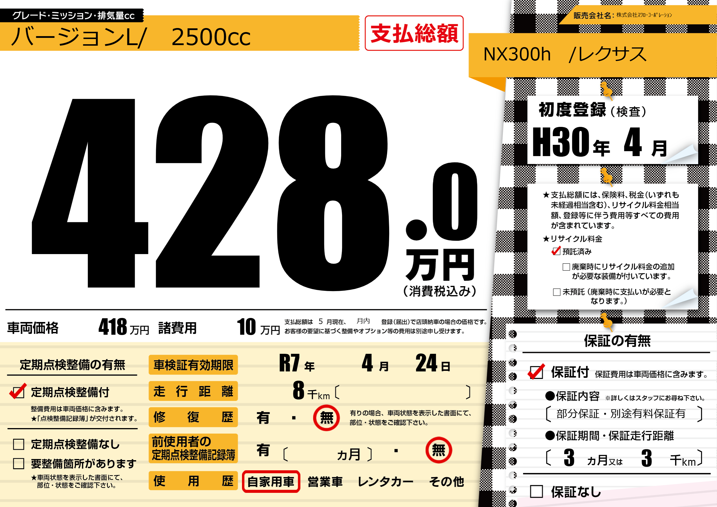 | 車名 | NX300h /レクサス | グレード ミッション 排気量 |