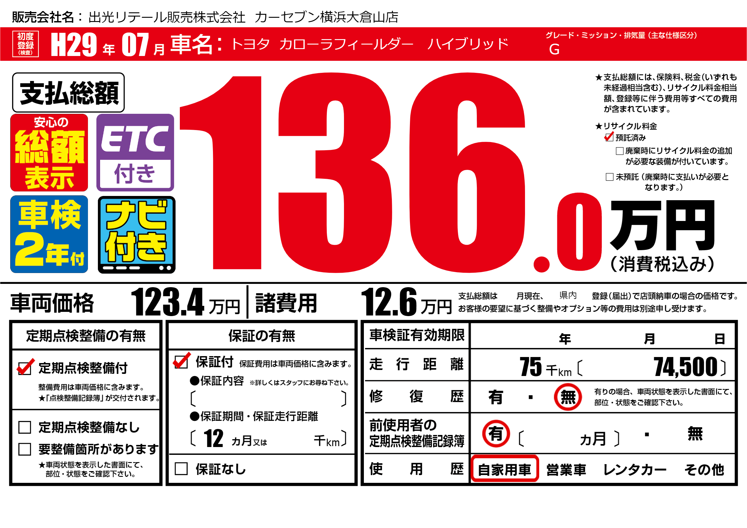 | 走行キロ | 7.5万km | 初年度登録 | H29年07月 |