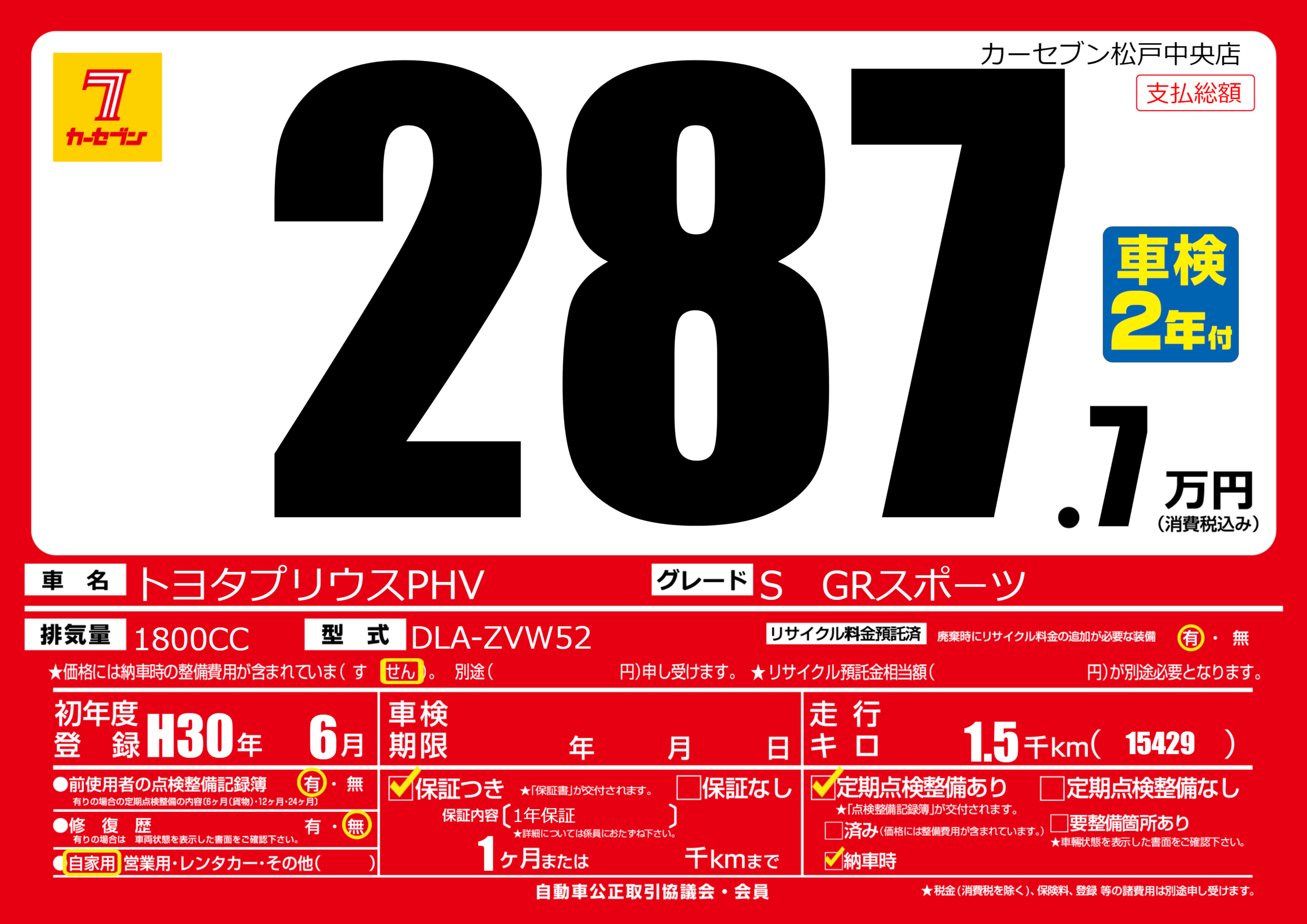 | 車名 | トヨタプリウスPHV | グレード ミッション 排気量 |