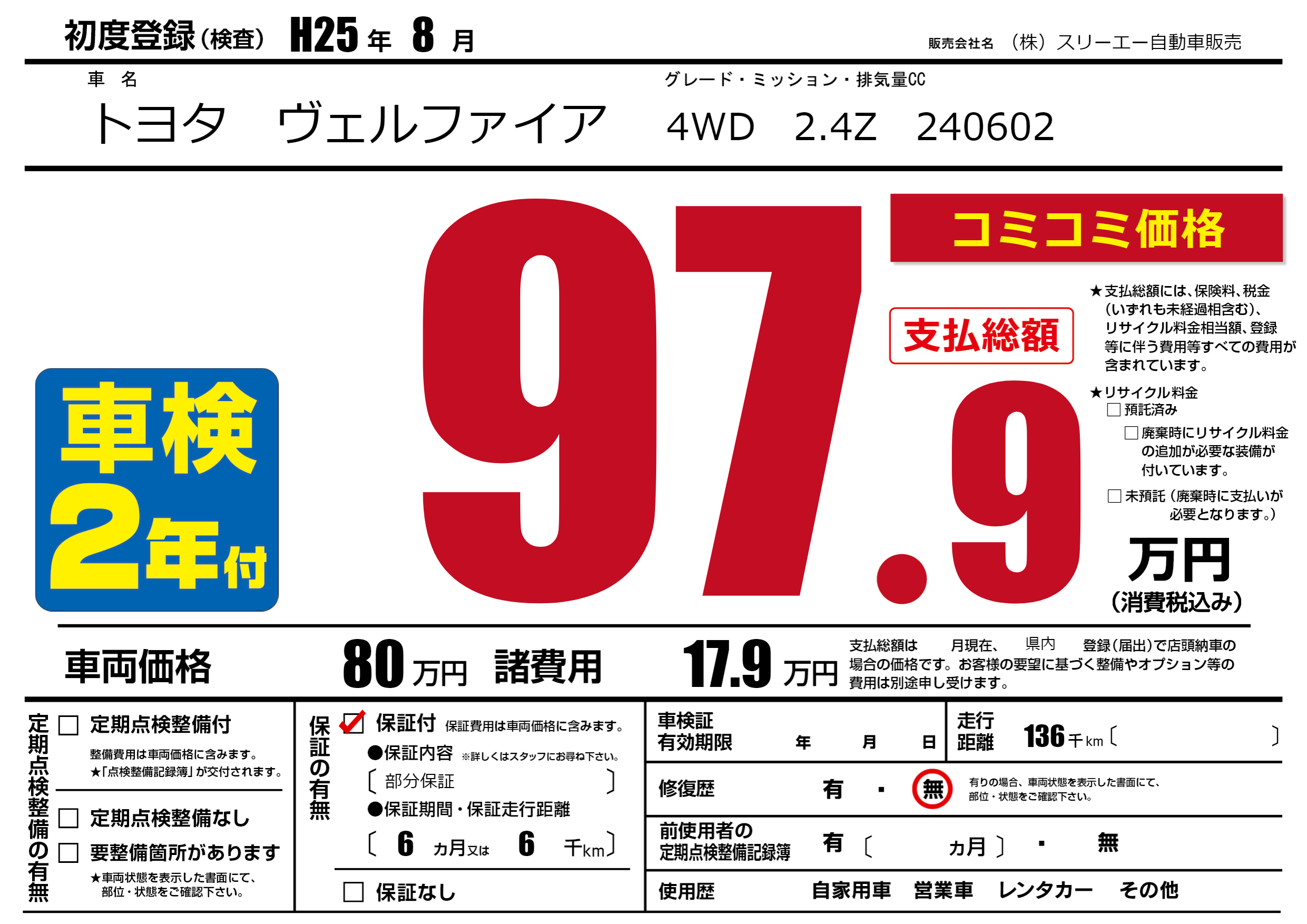 | 車名 | トヨタ ヴェルファイア | グレード ミッション 排気量 |