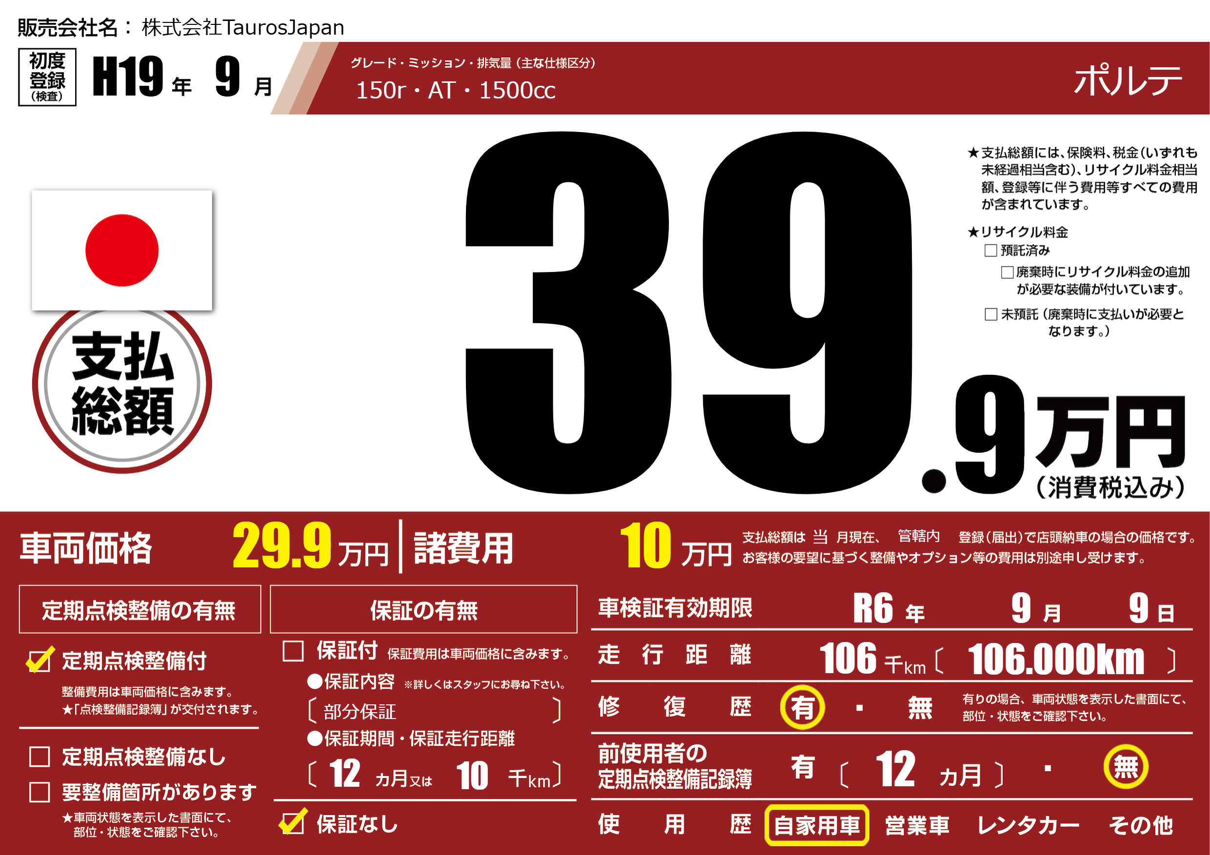 | 車名 | ポルテ | グレード ミッション 排気量 |