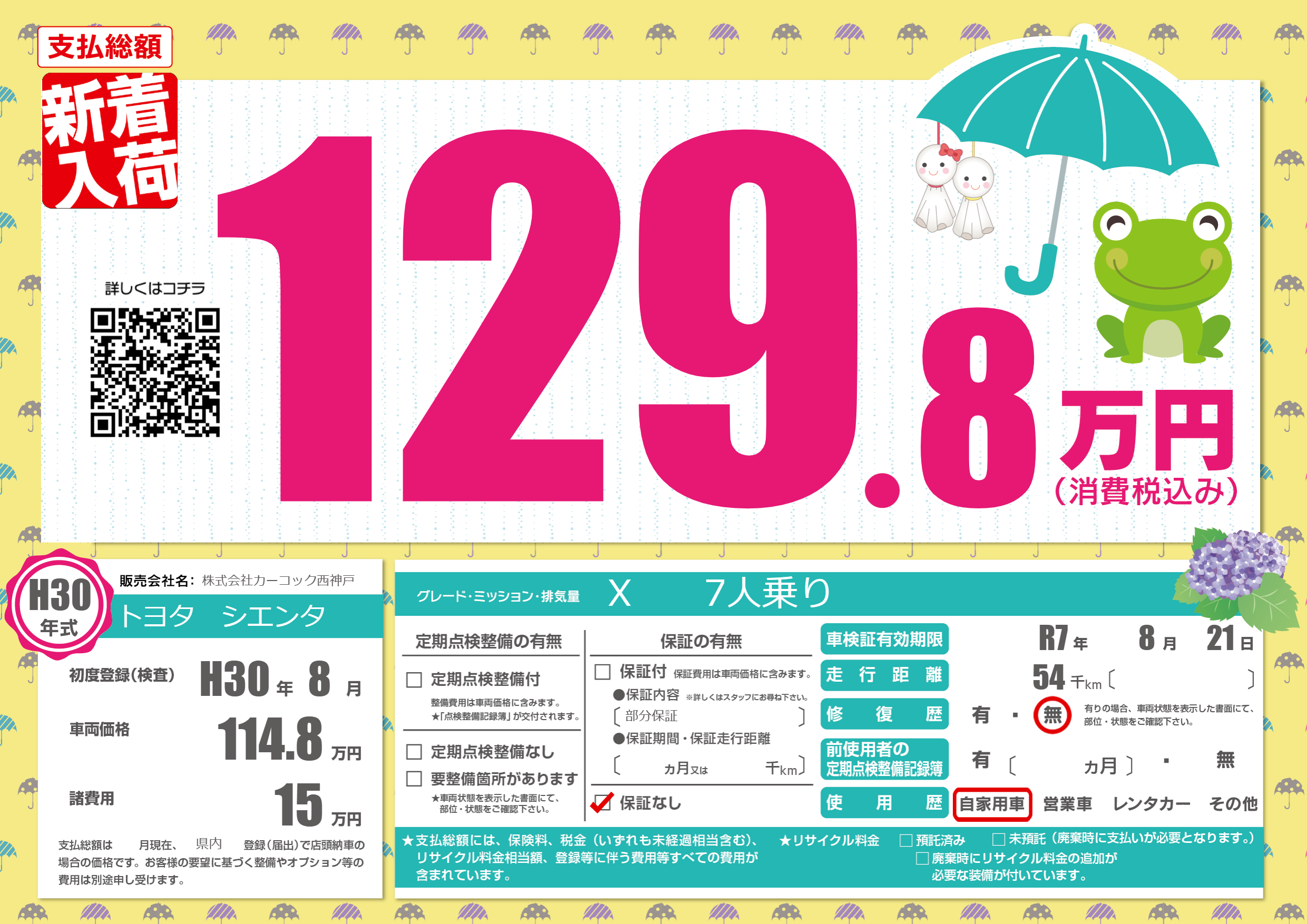 | 車名 | トヨタ シエンタ | グレード ミッション 排気量 |