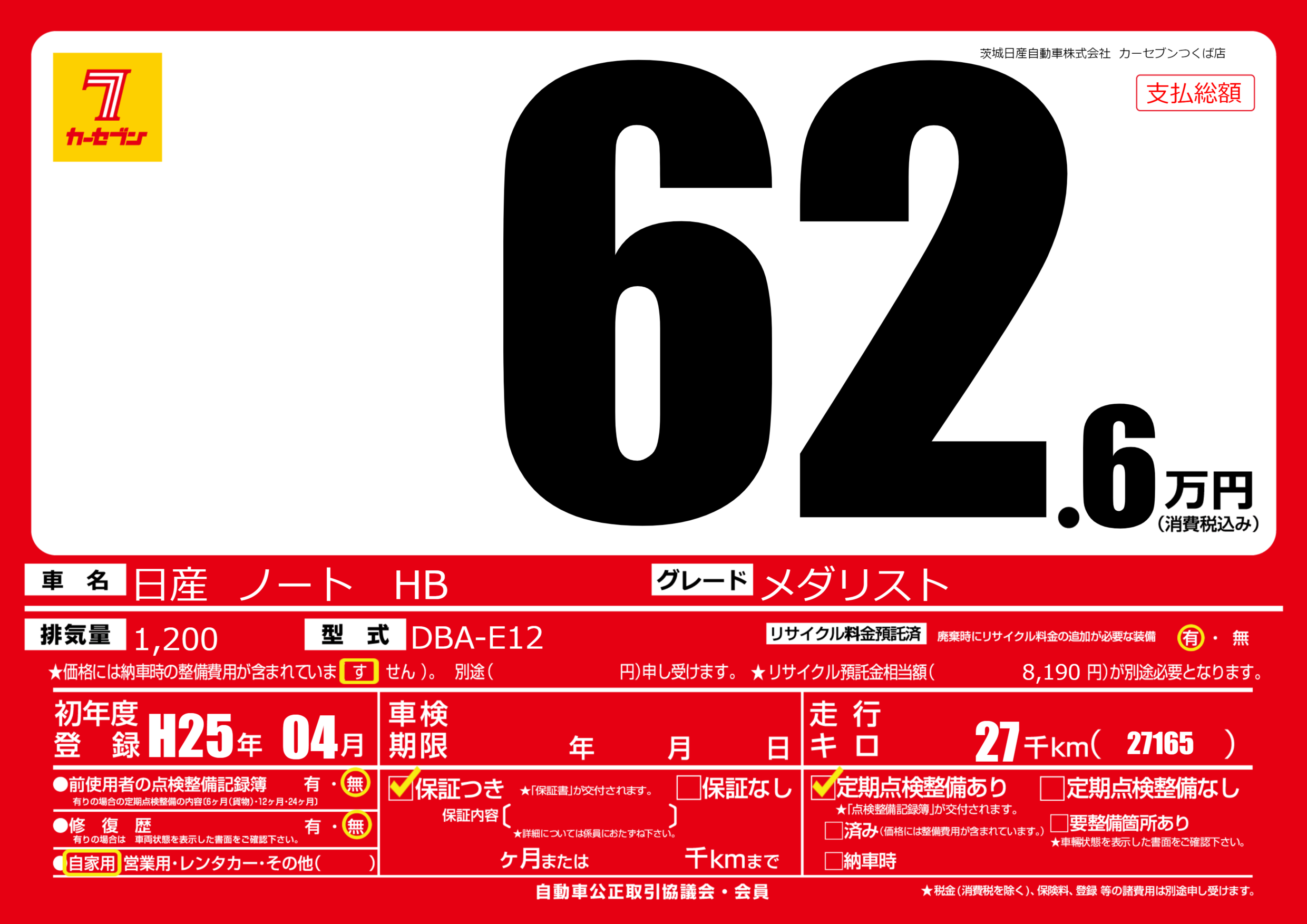 | 車名 | 日産 ノート HB | グレード ミッション 排気量 |