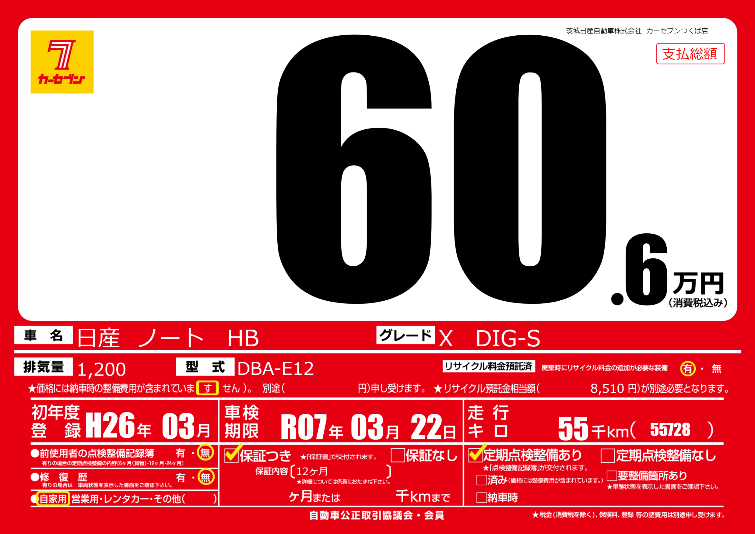 | 車名 | 日産 ノート HB | グレード ミッション 排気量 |