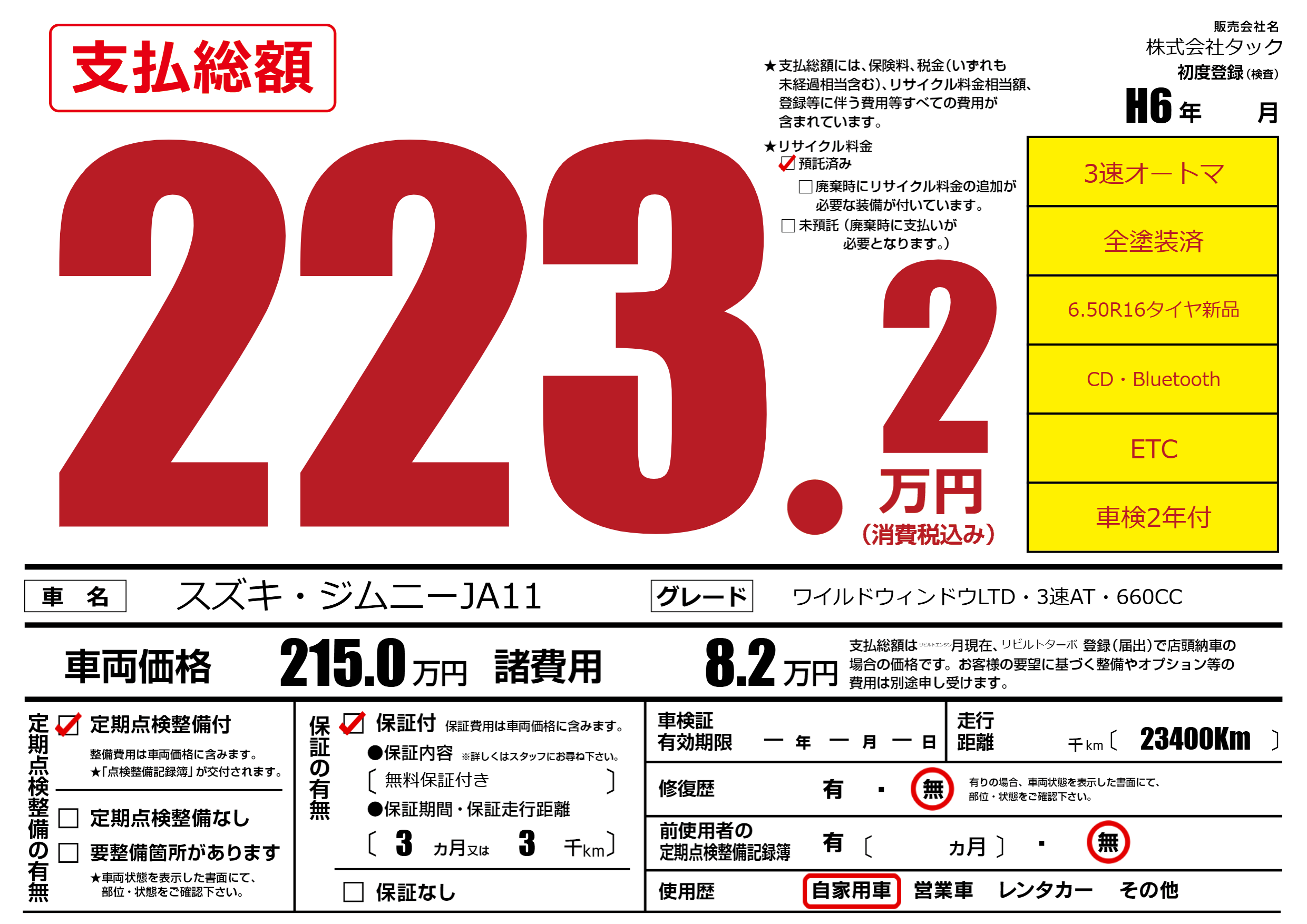 | 車名 | スズキ・ジムニーJA11 | グレード ミッション 排気量 |