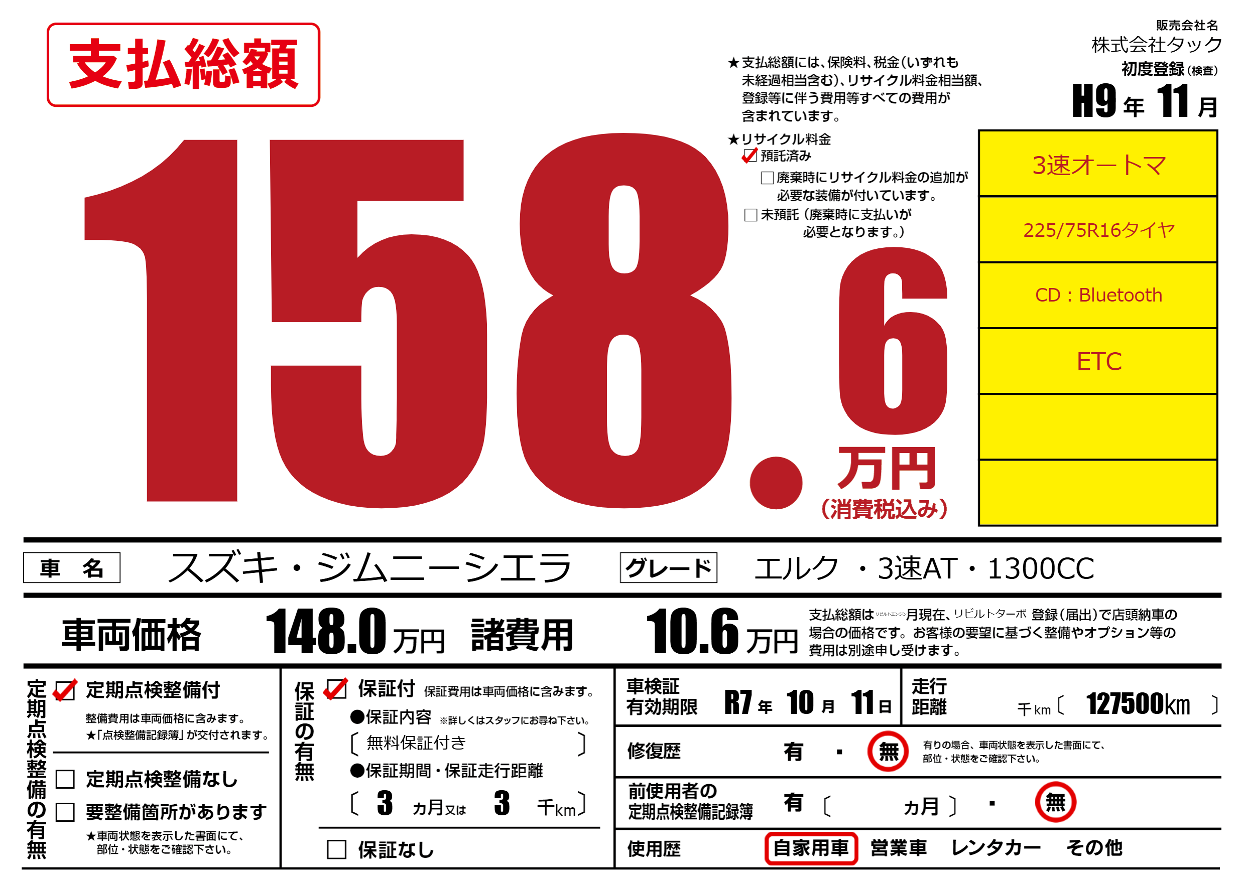 なし | 車検制限 | R7年10月11月 |