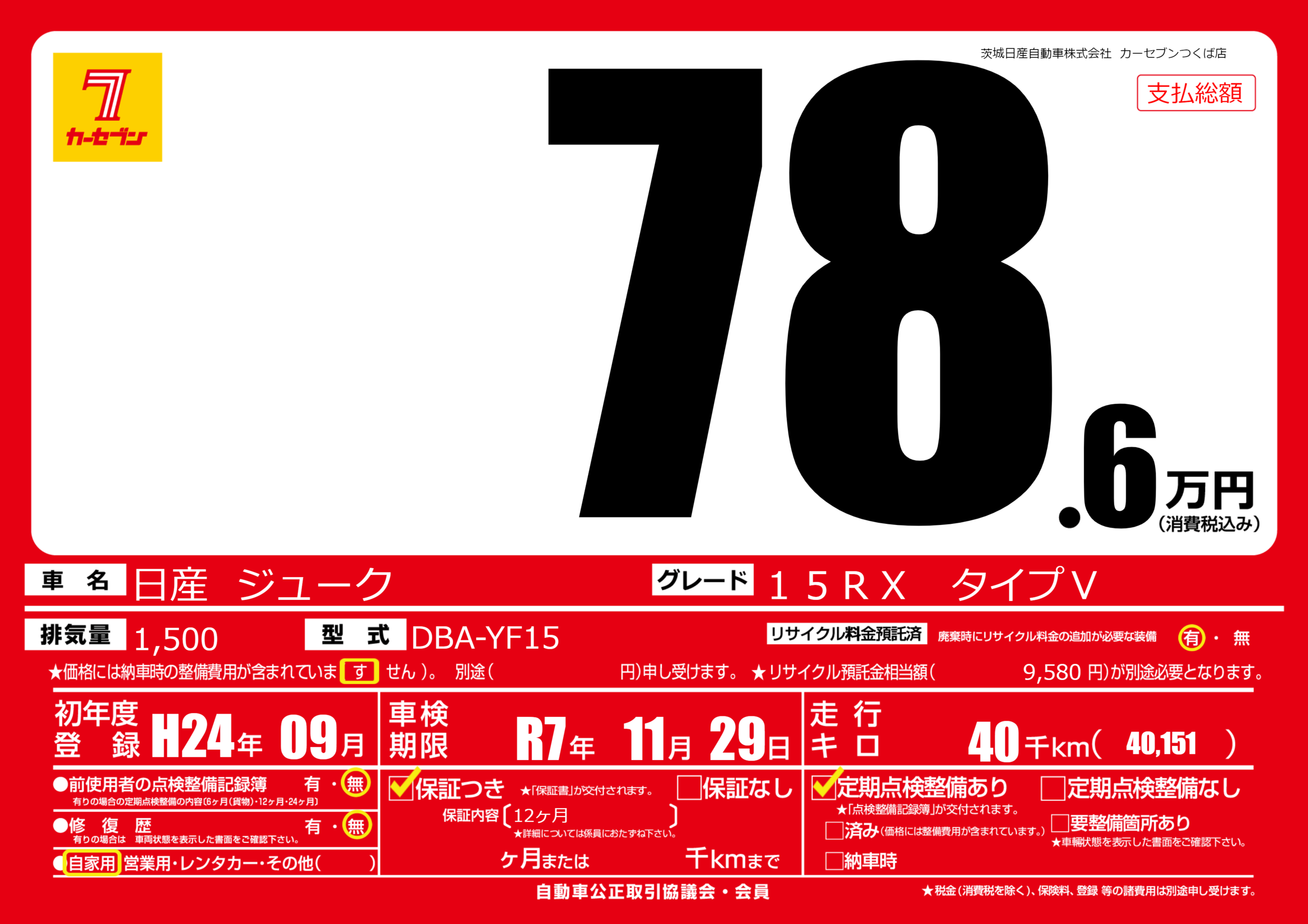 | 車名 | 日産 ジューク | グレード ミッション 排気量 |