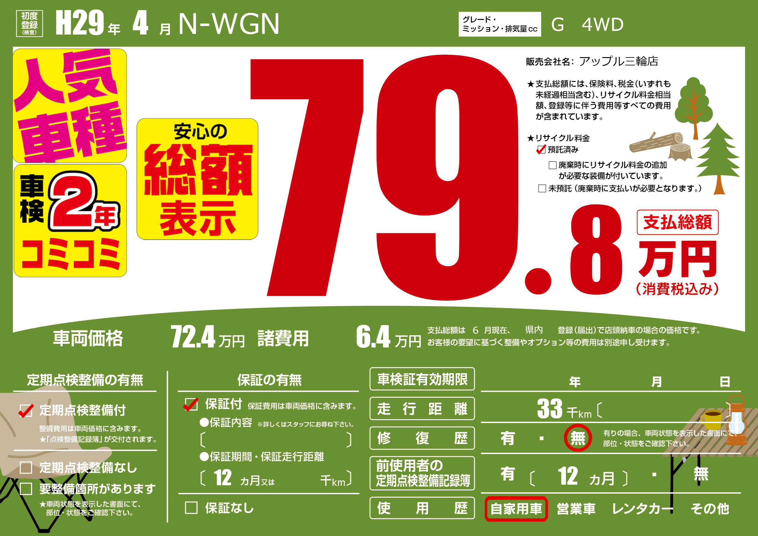 | 走行キロ | 3.3万km | 初年度登録 | H29年4月 |