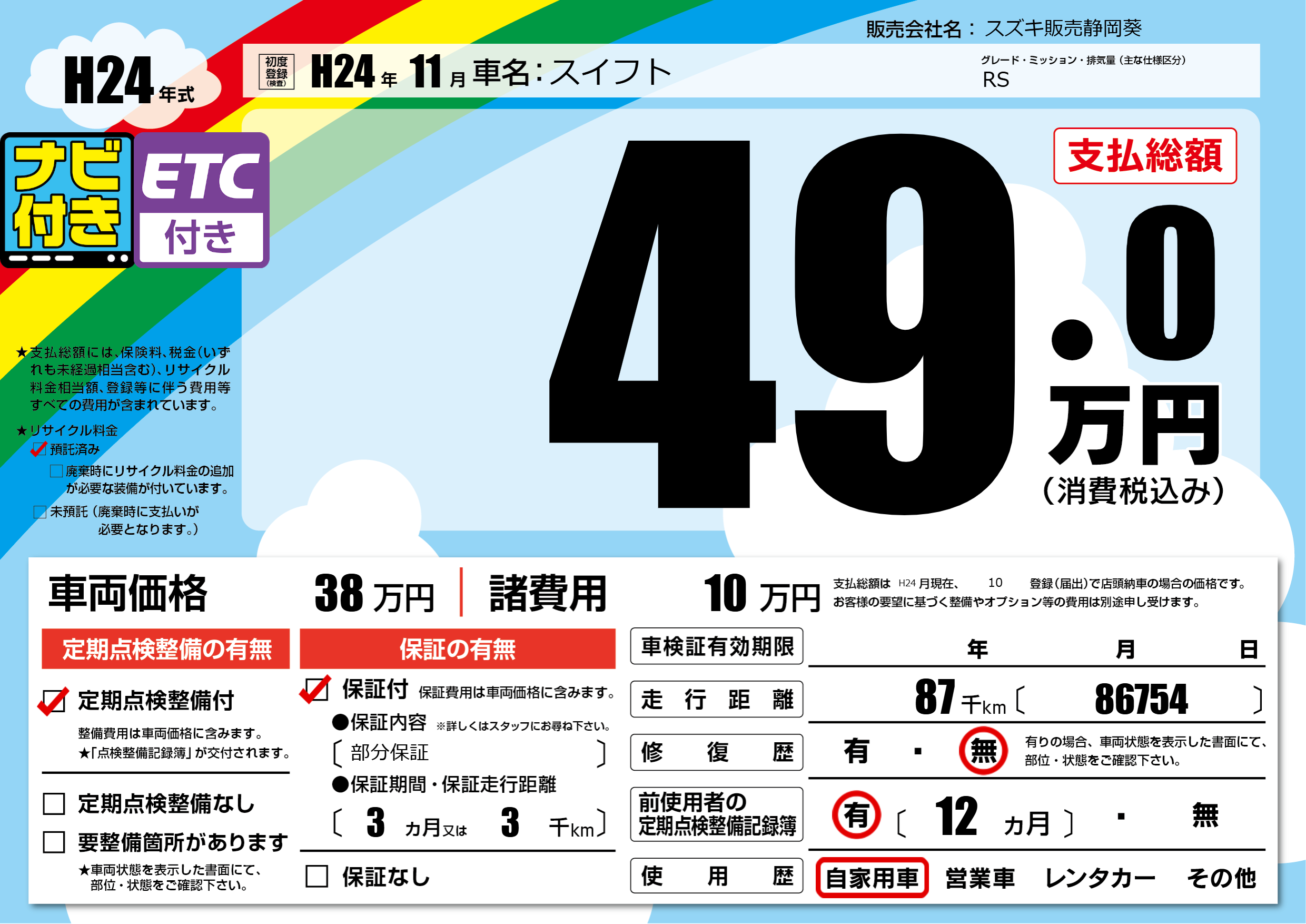 | 車名 | スイフト | グレード ミッション 排気量 |