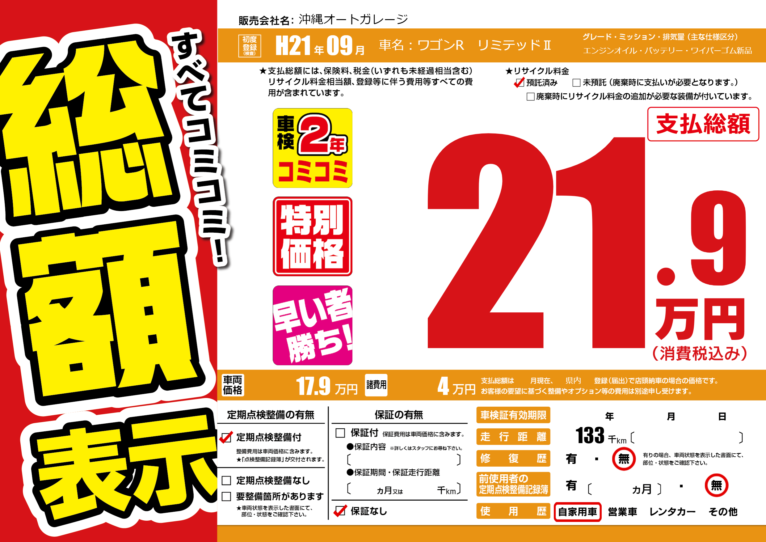 | 車名 | 車名:ワゴンR リミテッドⅡ | グレード ミッション 排気量 |