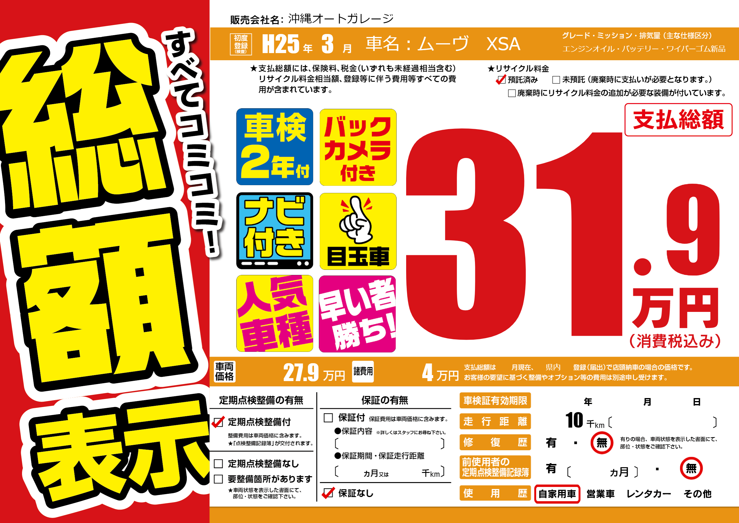 | 車名 | 車名:ムーヴ XSA | グレード ミッション 排気量 |