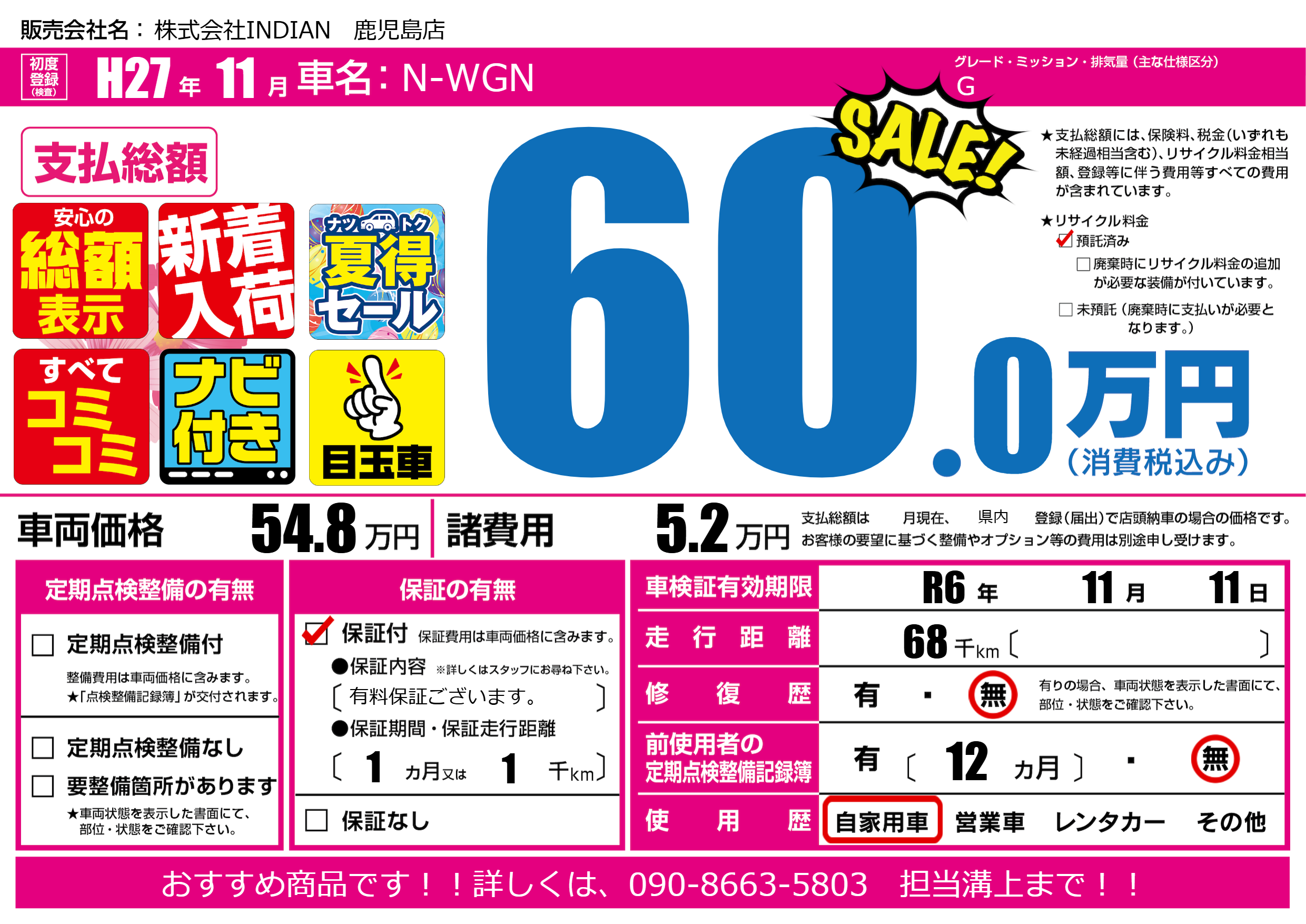 | 車名 | N-WGN | グレード ミッション 排気量 |
