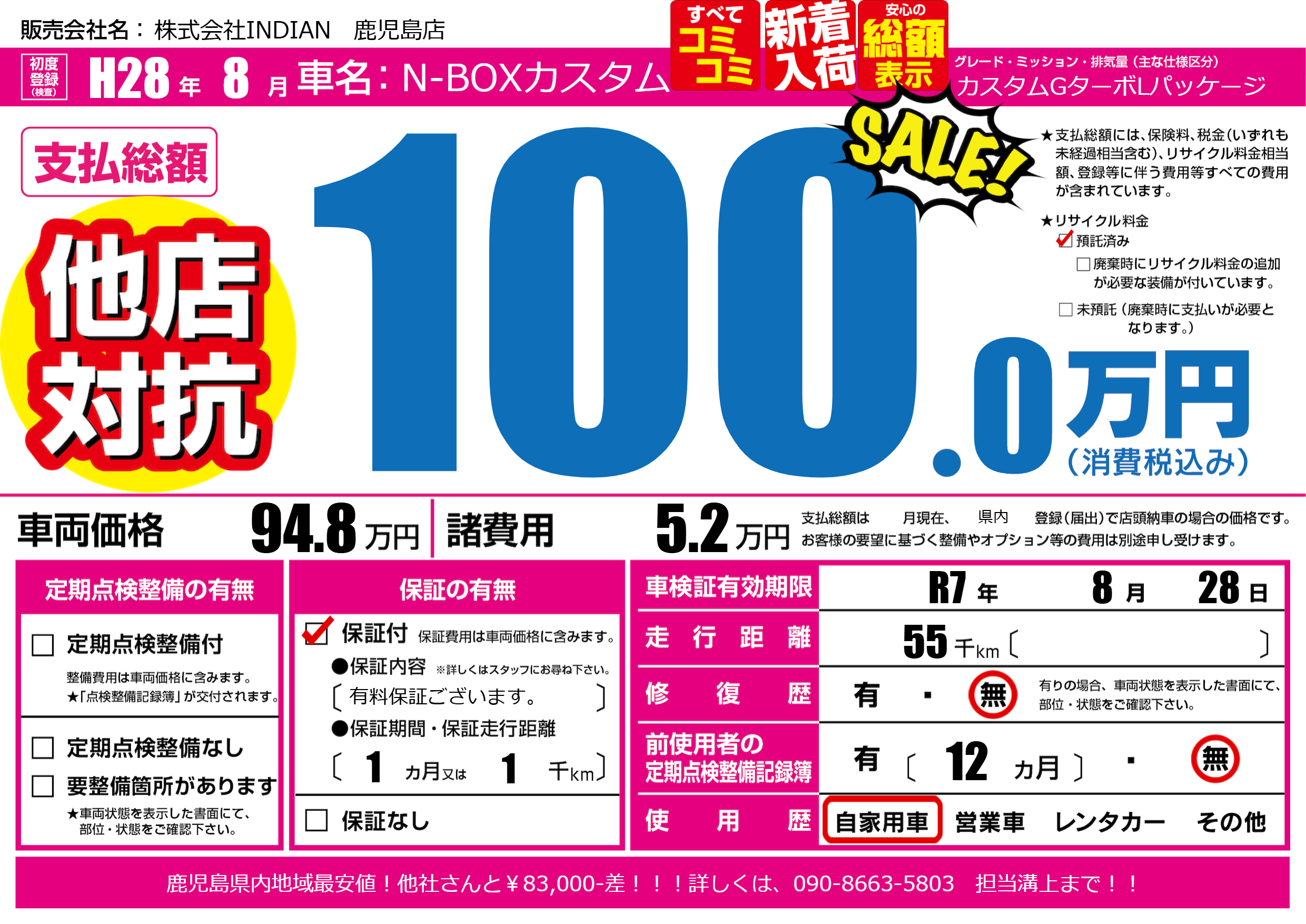 | 走行キロ | 5.5万km | 初年度登録 | H28年8月 |