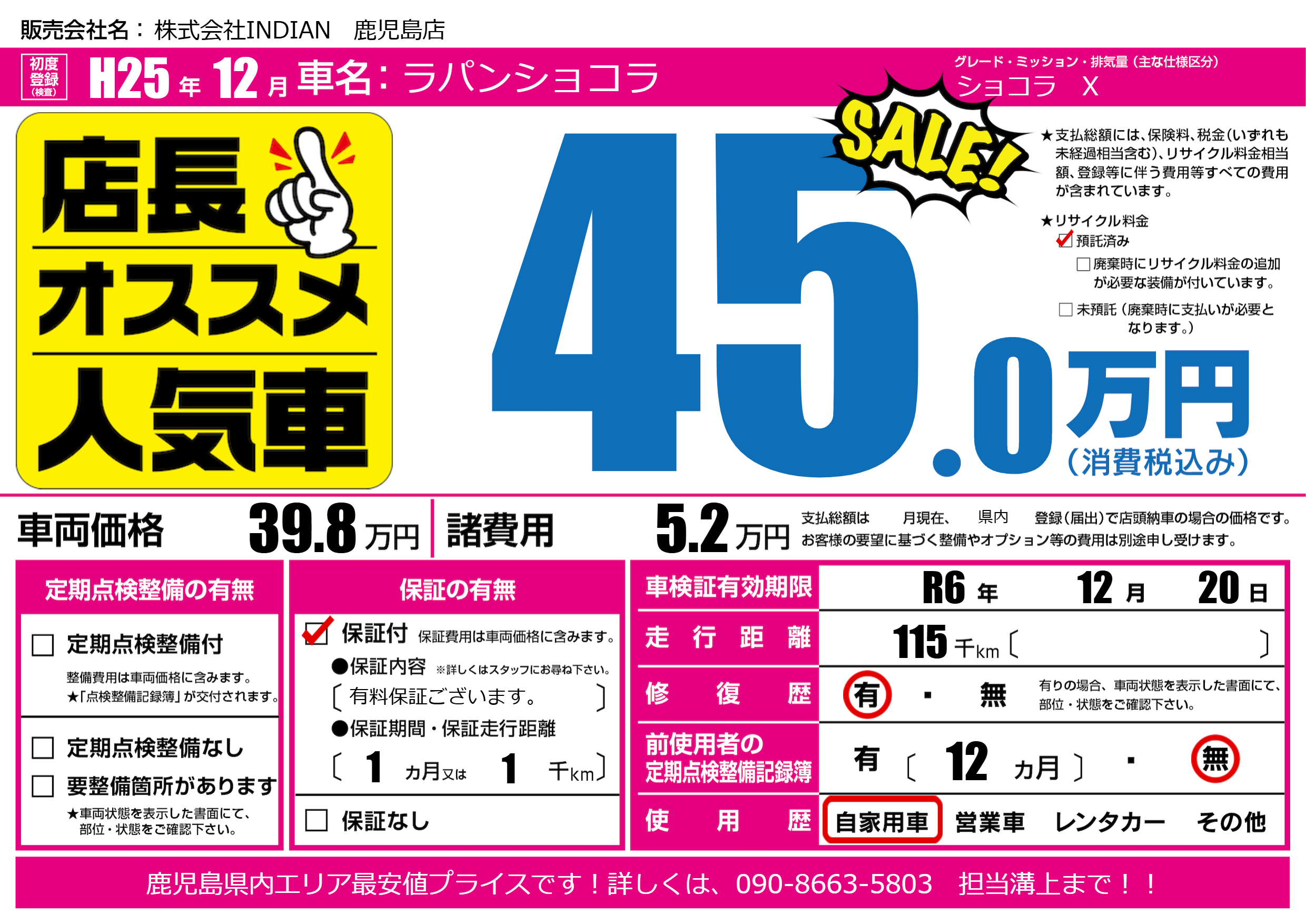| 車名 | ラパンショコラ | グレード ミッション 排気量 |