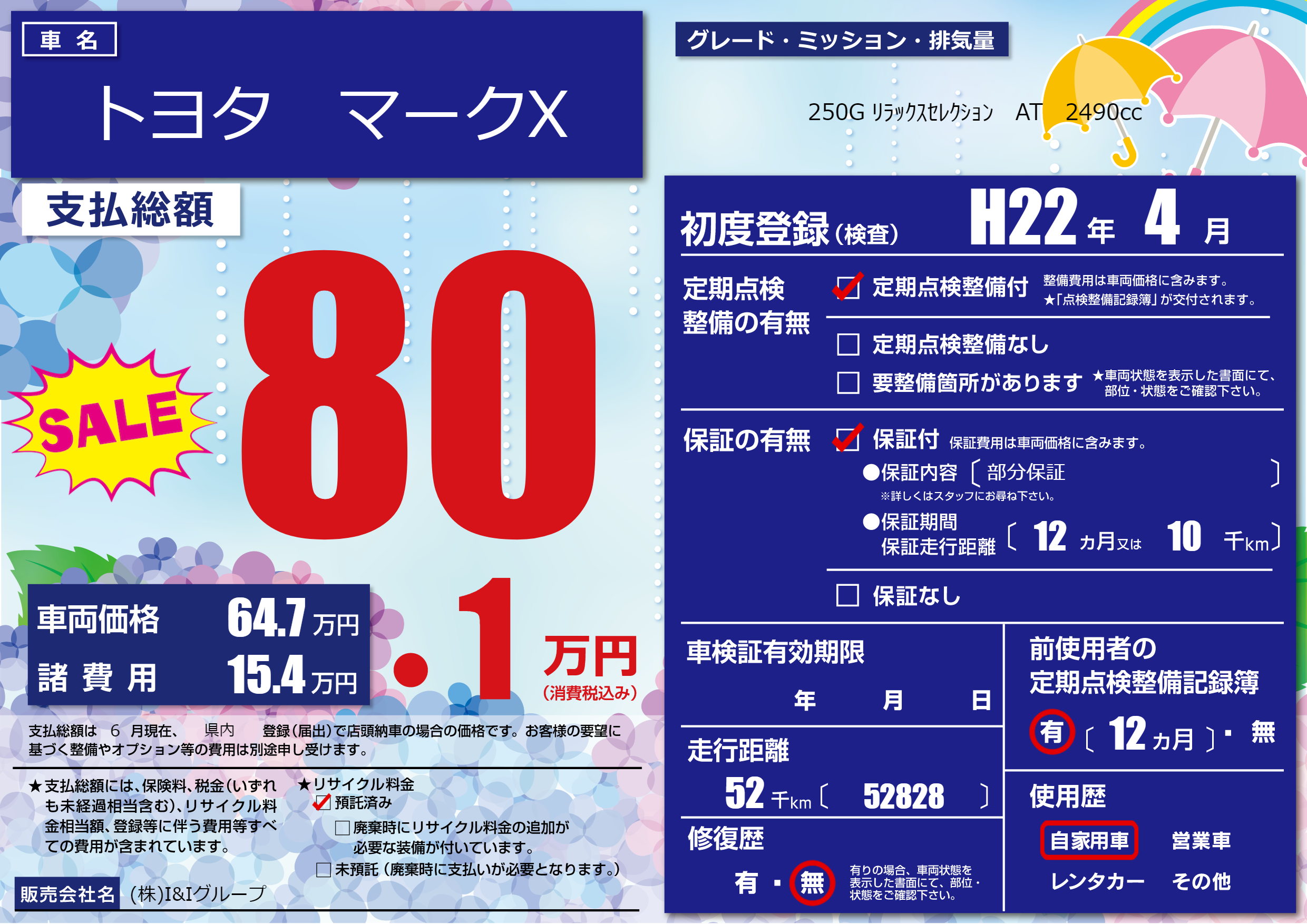 | 走行キロ | 5.2万km | 初年度登録 | H22年4月 |