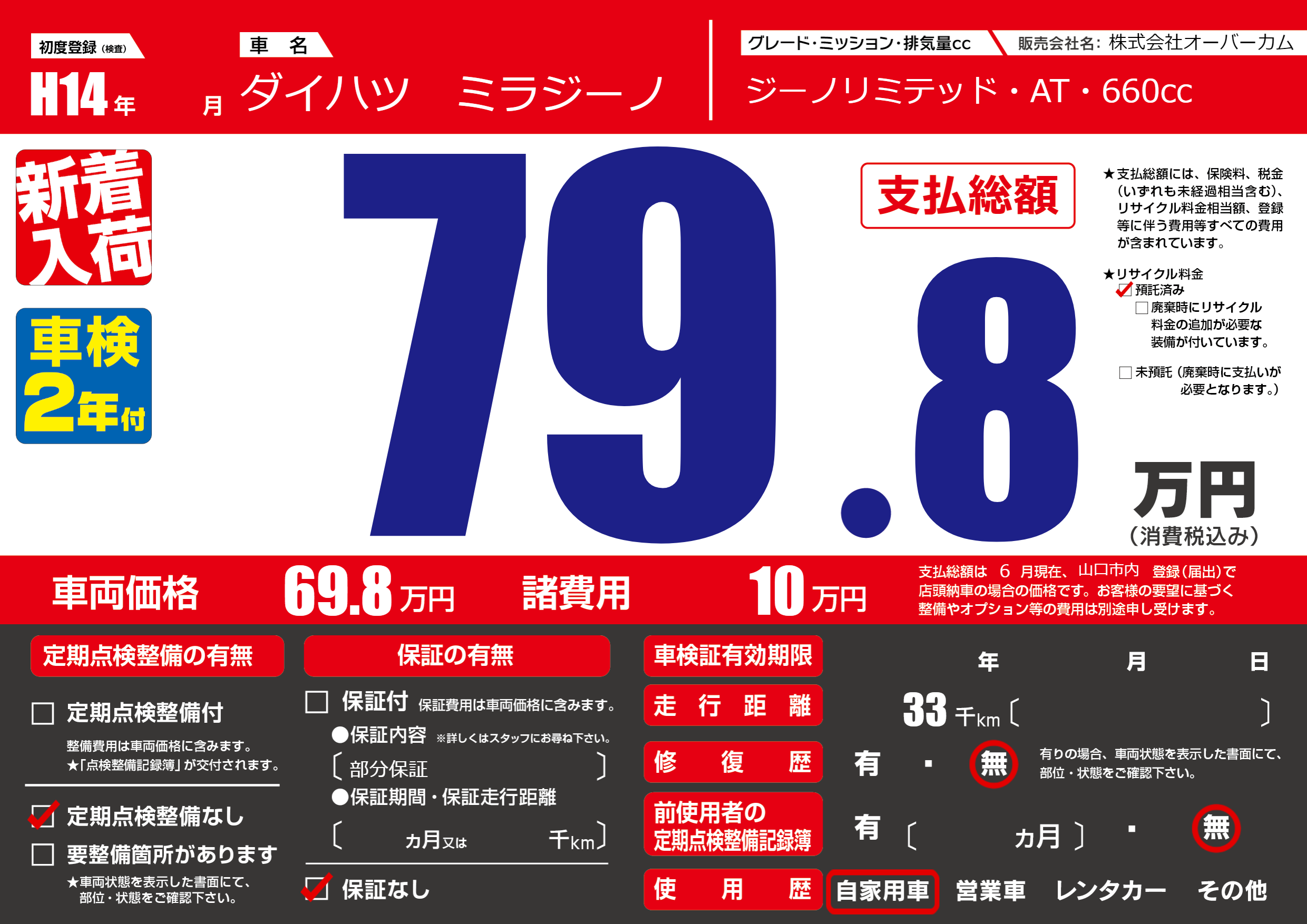 保証なし 保証内容(部分保証) ---ヶ月または()千kmまで |