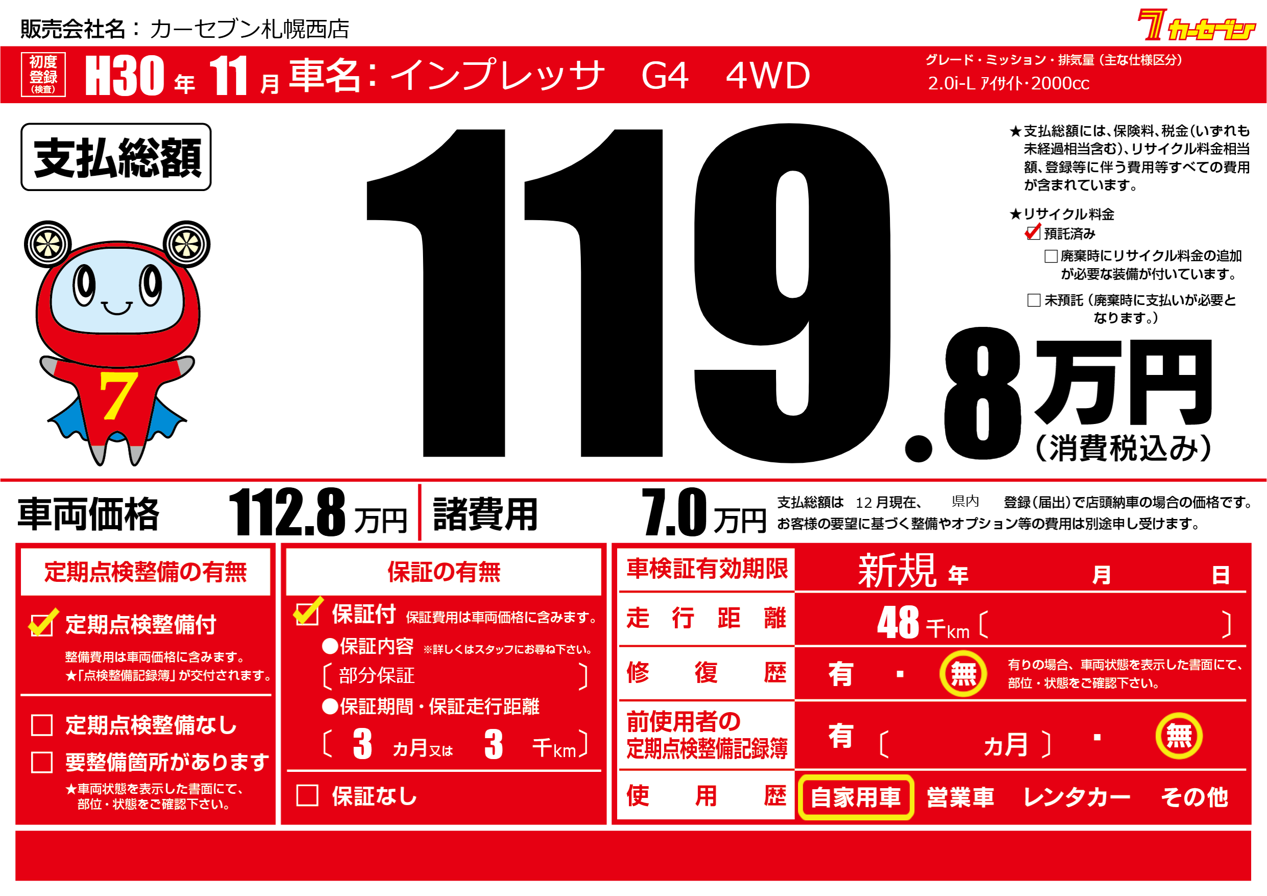 | 車名 | インプレッサ G4 4WD | グレード ミッション 排気量 |