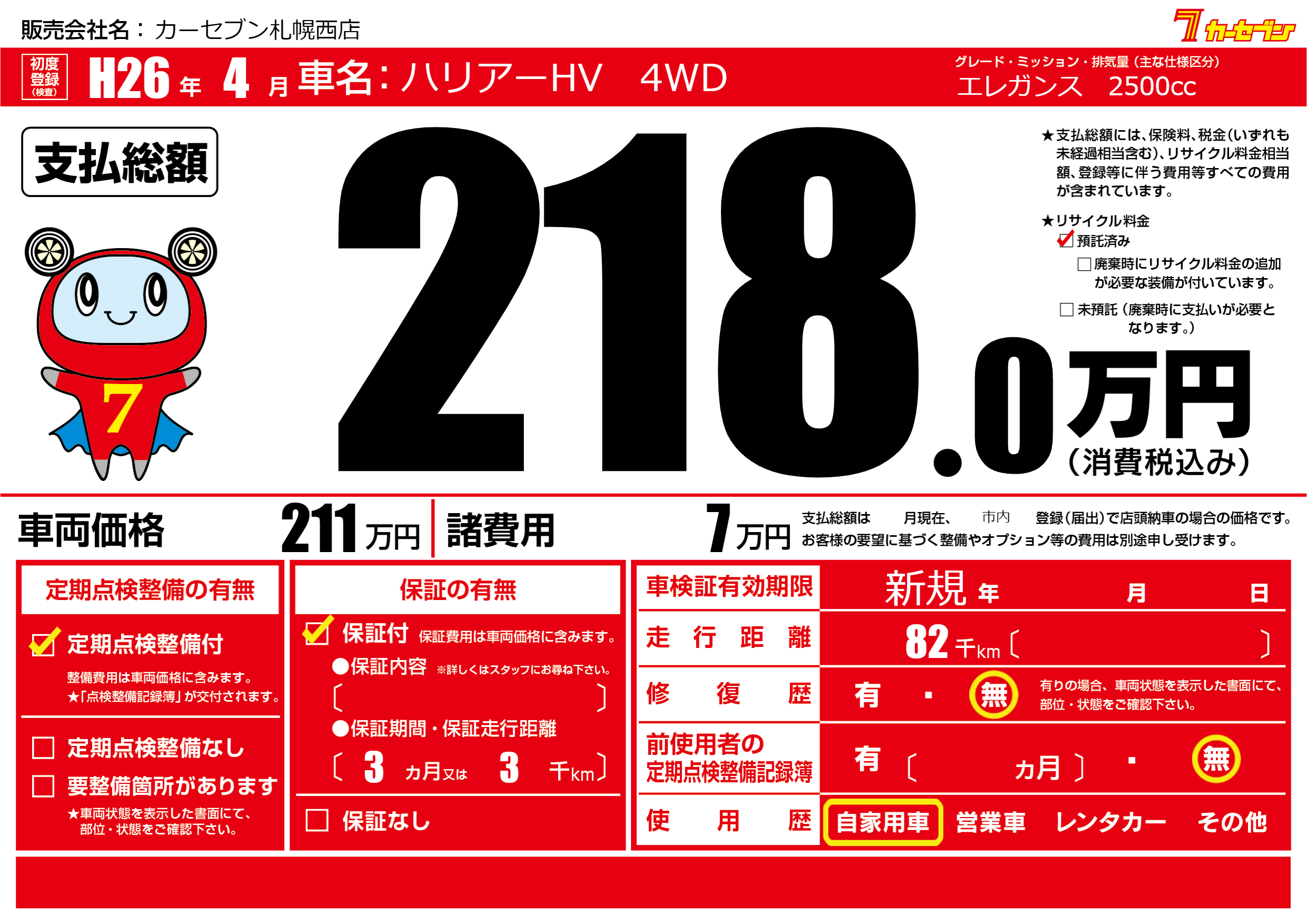 | 走行キロ | 8.2万km | 初年度登録 | H26年4月 |