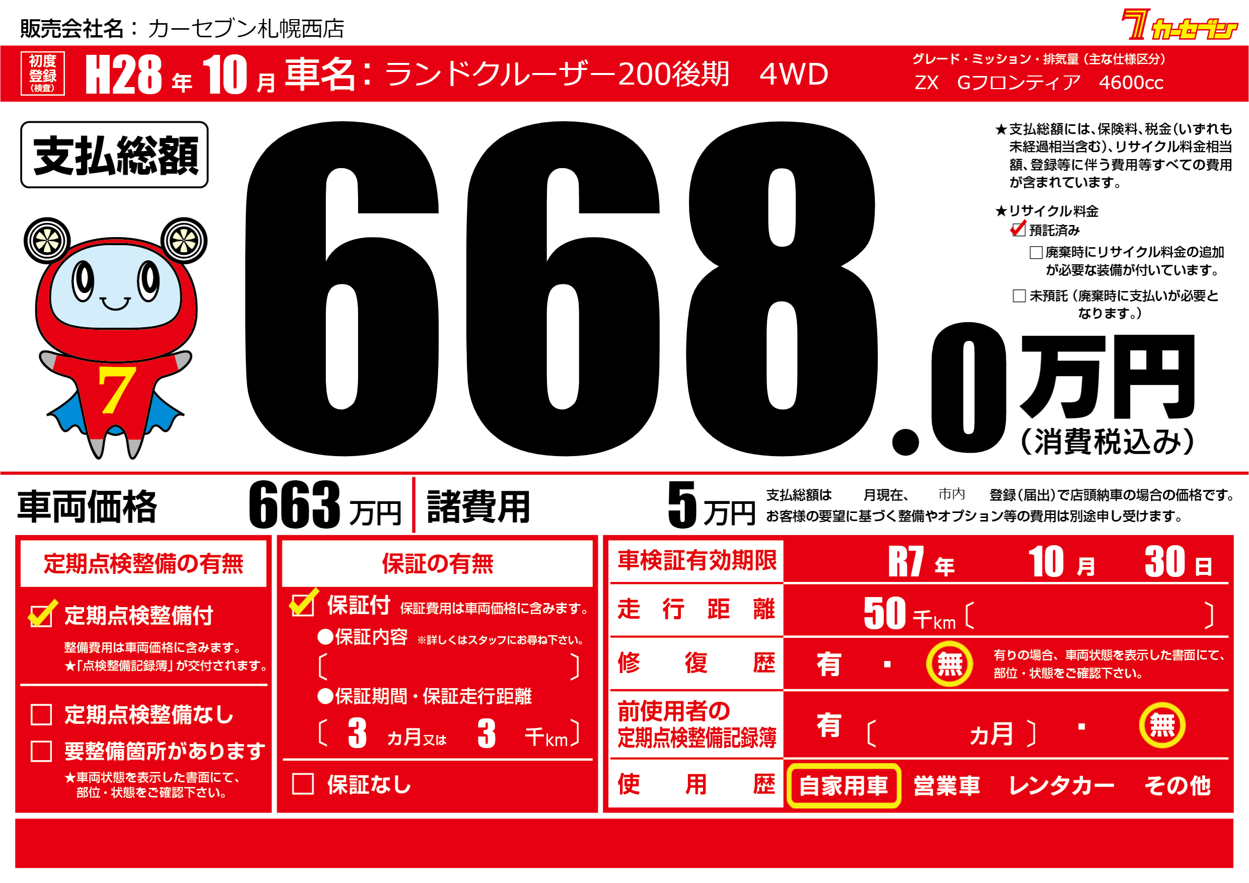 | 走行キロ | 5万km | 初年度登録 | H28年10月 |