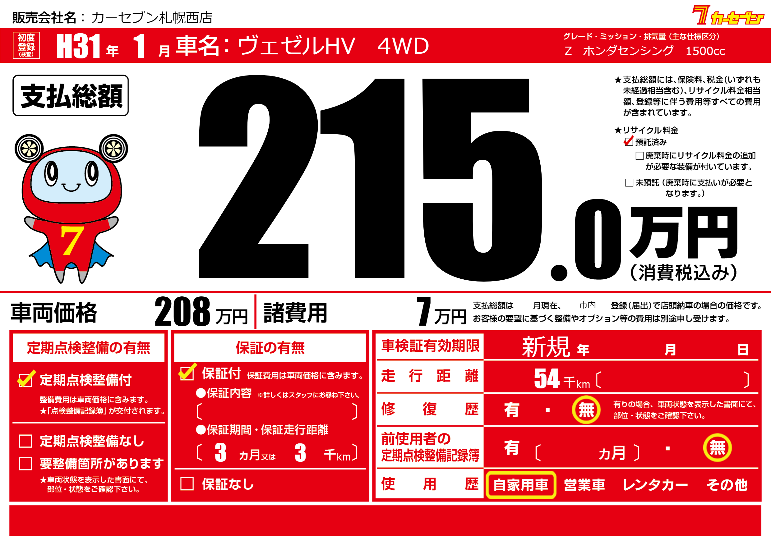 | 車名 | ヴェゼルHV 4WD | グレード ミッション 排気量 |