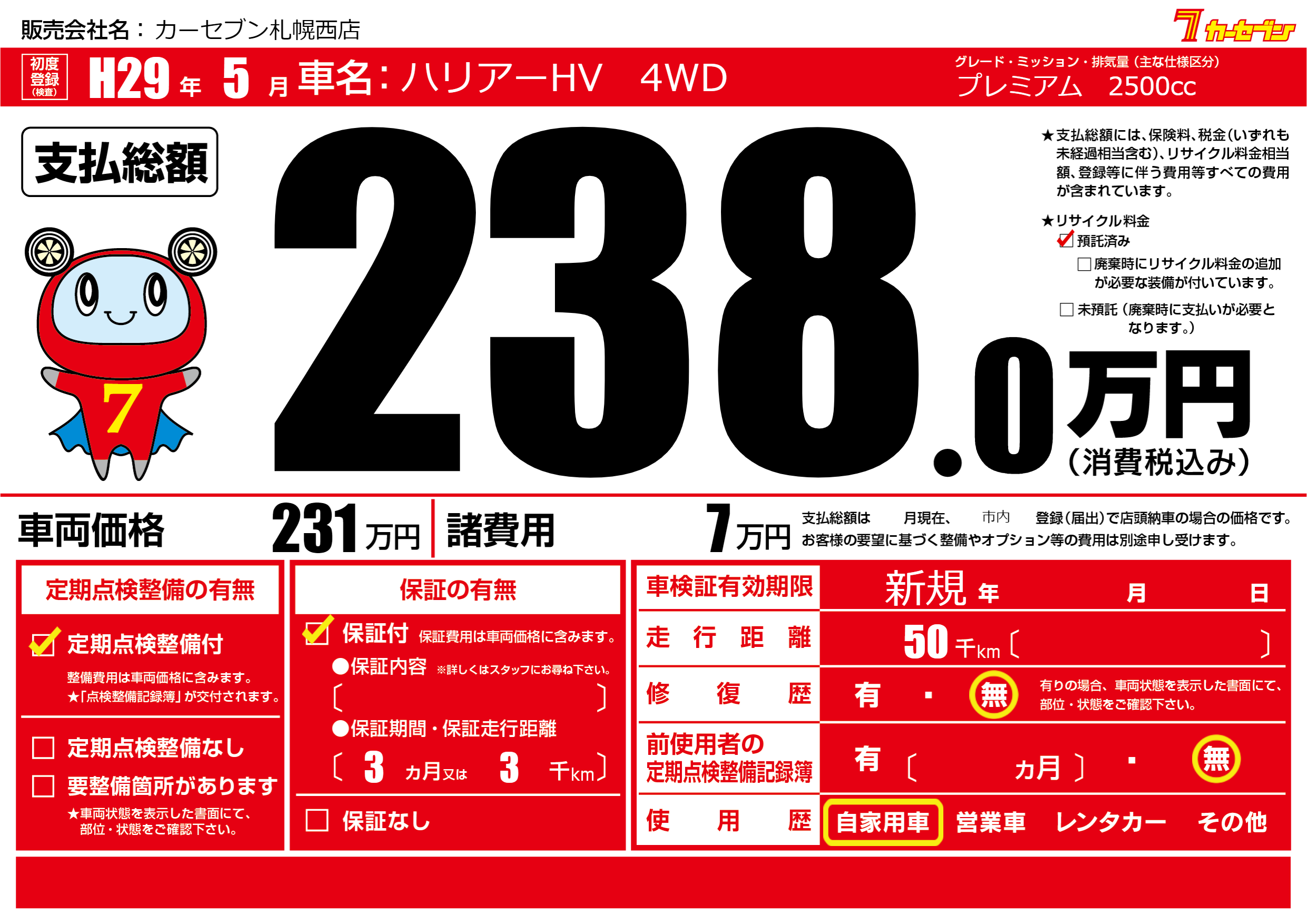| 走行キロ | 5万km | 初年度登録 | H29年5月 |