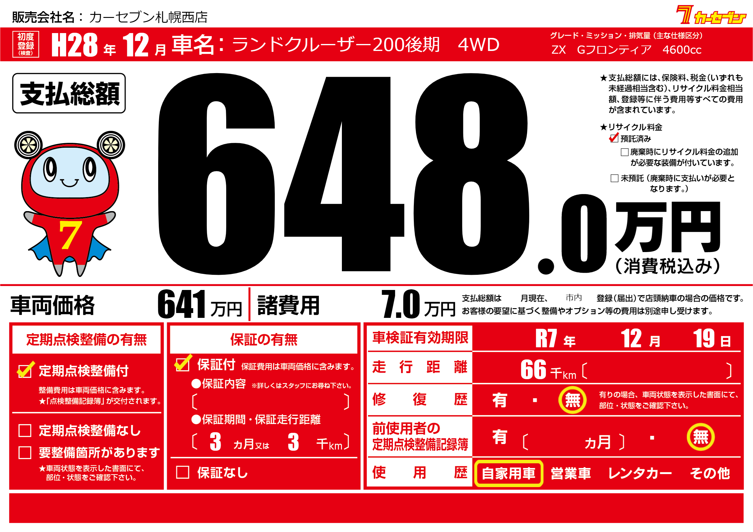 | 走行キロ | 6.6万km | 初年度登録 | H28年12月 |